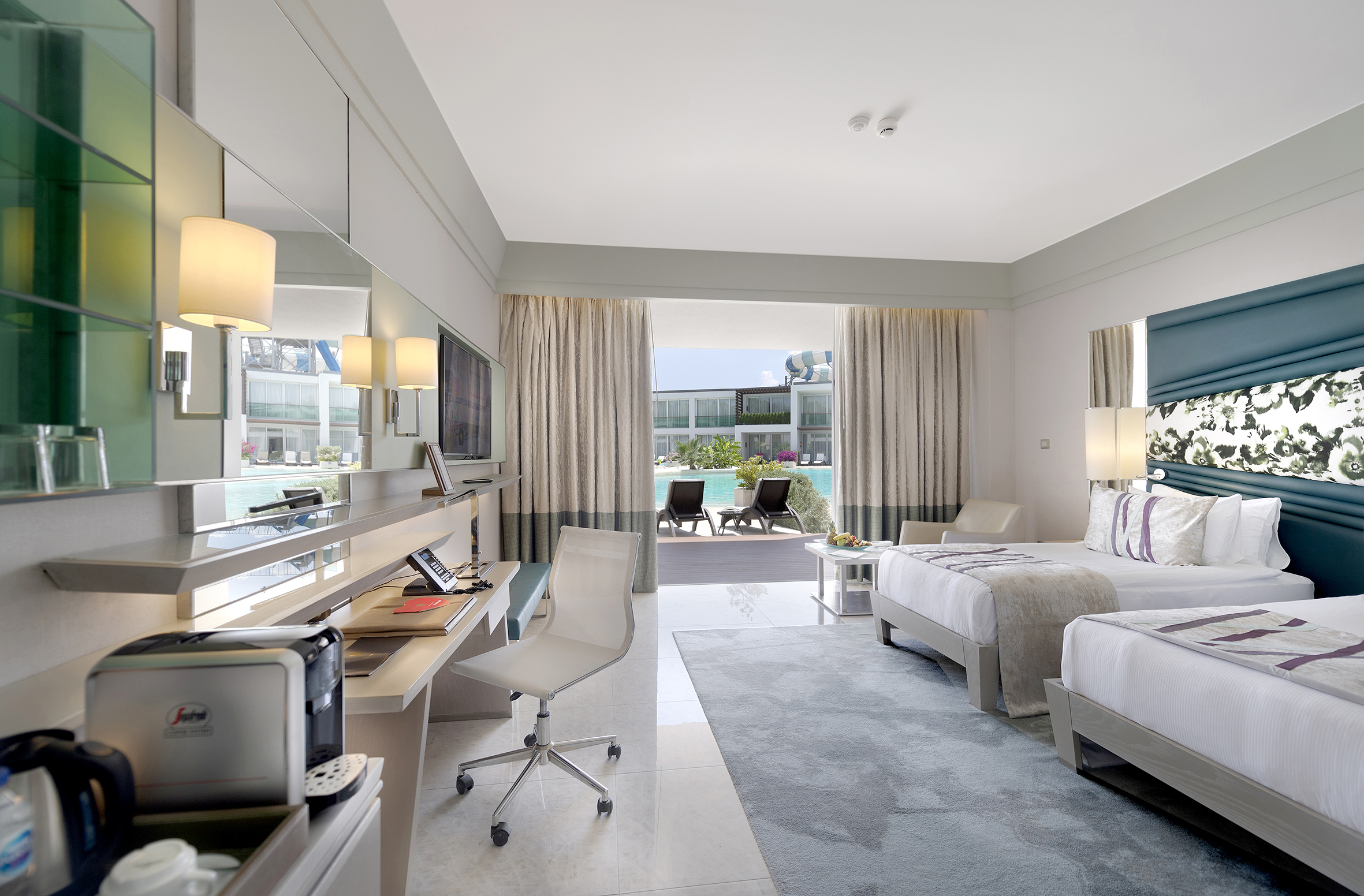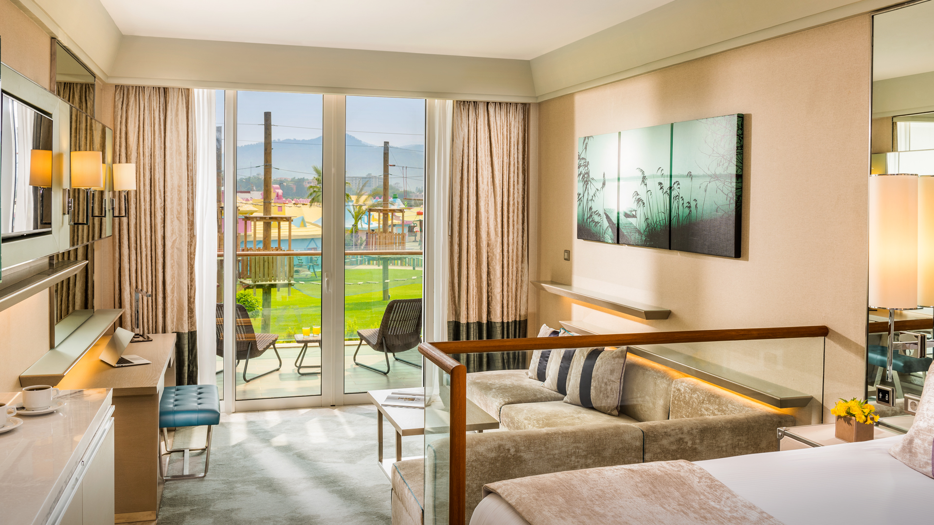 У кожному номері Делюкс розташовані двоспальне або два односпальні ліжка та диван, робочий стіл, IP LED телевізор, музичне телевізійне мовлення, мінібар, телефон, кондиціонер (працює в залежності від погодних умов), електронний сейф, балкон, килимове та мармурове покриття, ванна кімната з душем та туалетом, фен, особистий набір, халат, капці, набір для гарячих напоїв, набір для дітей. Максимальне розміщення 2+1