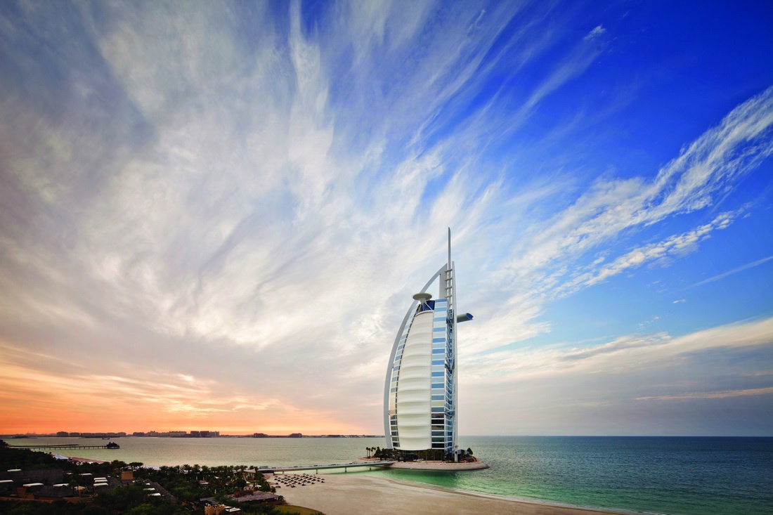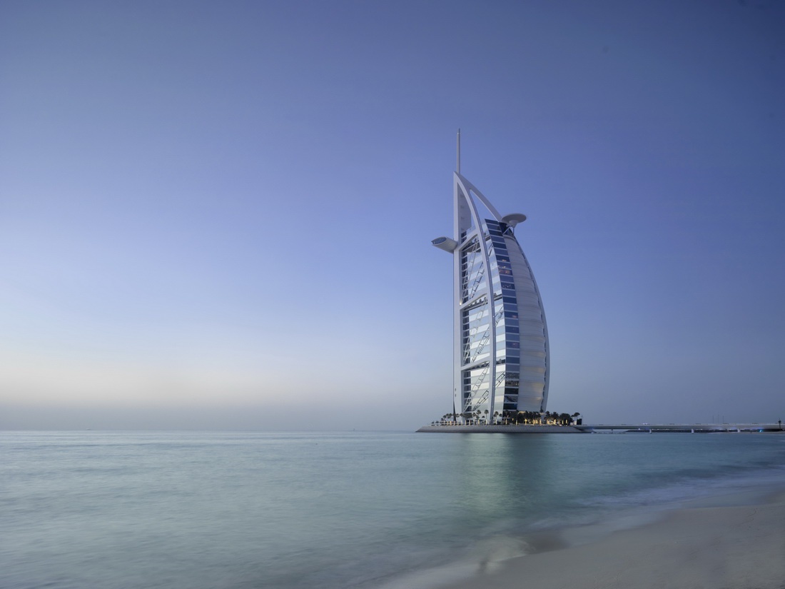Всесвітньо відомий готель Burj Al Arab, який нагадує чудовий величезний корабель з білосніжним полотном, що майорить на південних вітрах, розташувався на відокремленому острові, насипаному у вигляді м'якого трикутника. Узбережжя Перської затоки у цій місцевості вкрите смарагдовими тропічними пейзажами. Цей красень висотою 300 метрів - одна з пам'яток Дубая, що найбільш запам'ятовуються.
