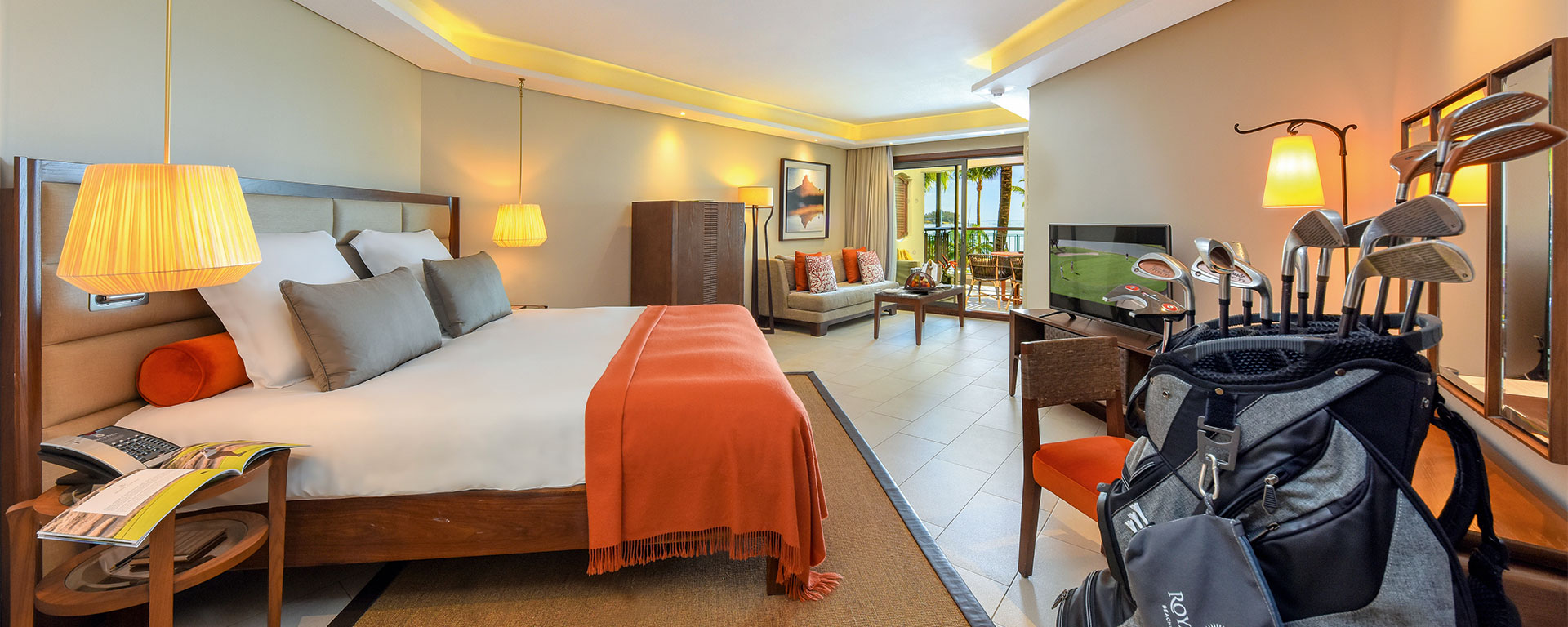 63 кв. м. Гольф-люкс оформлений у м'яких персикових тонах, що створює затишну та заспокійливу атмосферу в номері, що складається зі спальні із зоною відпочинку, ванної кімнати з ванною та душем, окремого туалету, гардеробної та мебльованої тераси, розташованої у тропічному саду. При бронюванні люкс гостям надається щоденний вільний доступ до гольф-поле готелю та гольф-карта. Номер розрахований на 2 дорослі.