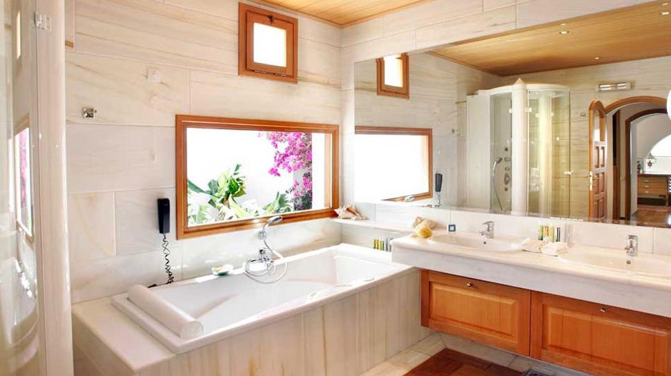 Площа 115 кв. м. Просторий двоповерховий люкс з 1 головною спальнею і 1 спальнею з односпальним ліжком, вітальнею, мармуровою ванною кімнатою з ванною і душовою кабіною, додатковим душем і туалетом. Також, є приватний басейн з морською водою і підігрівом.