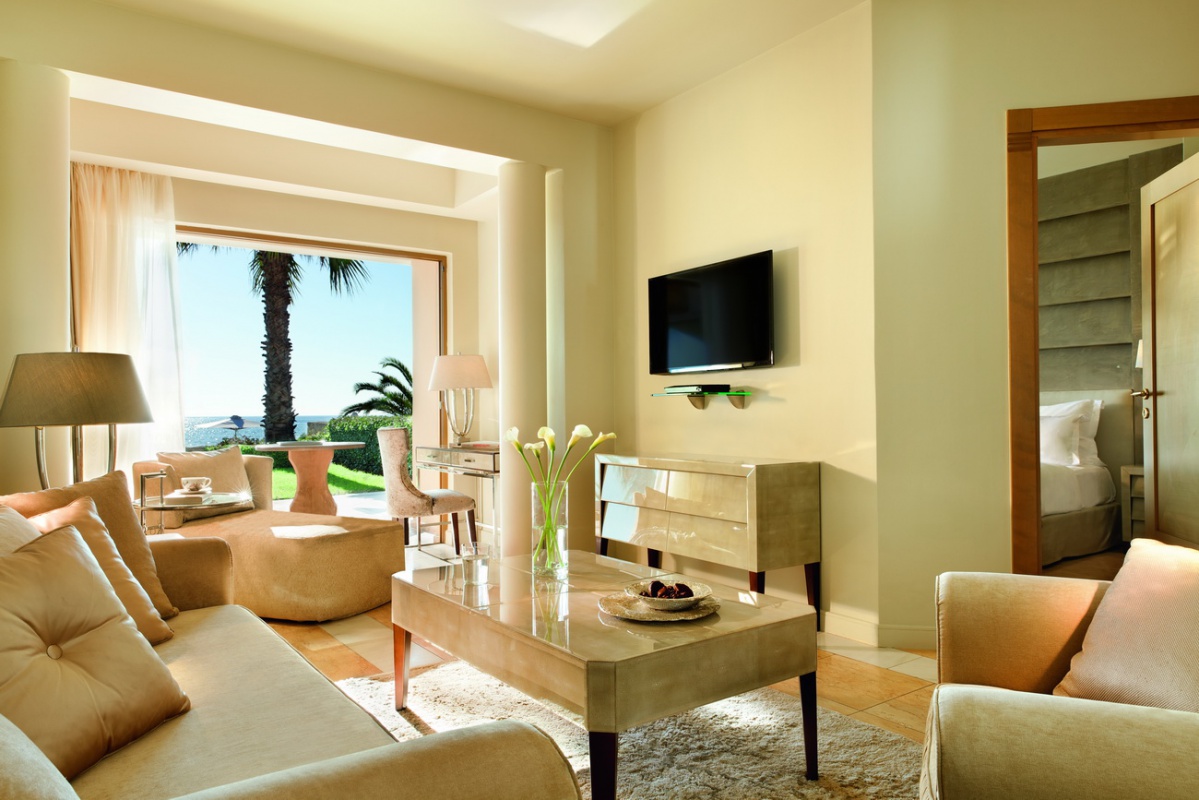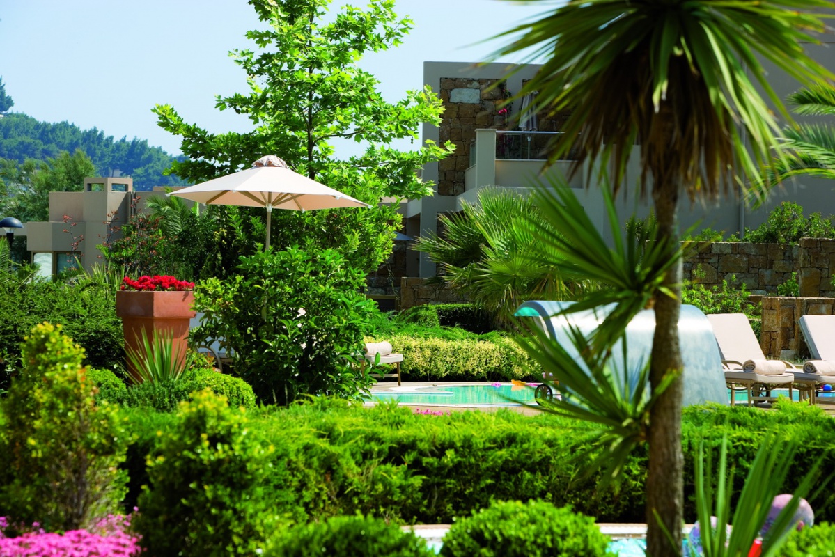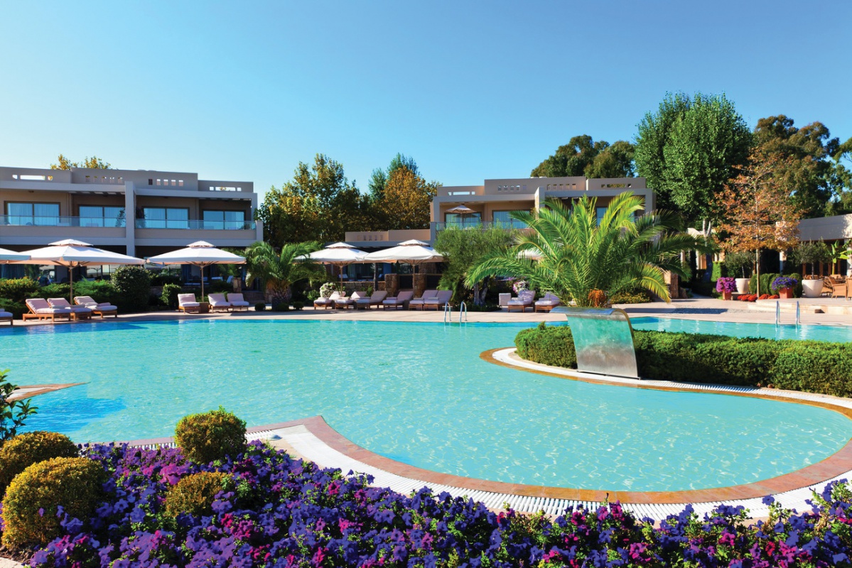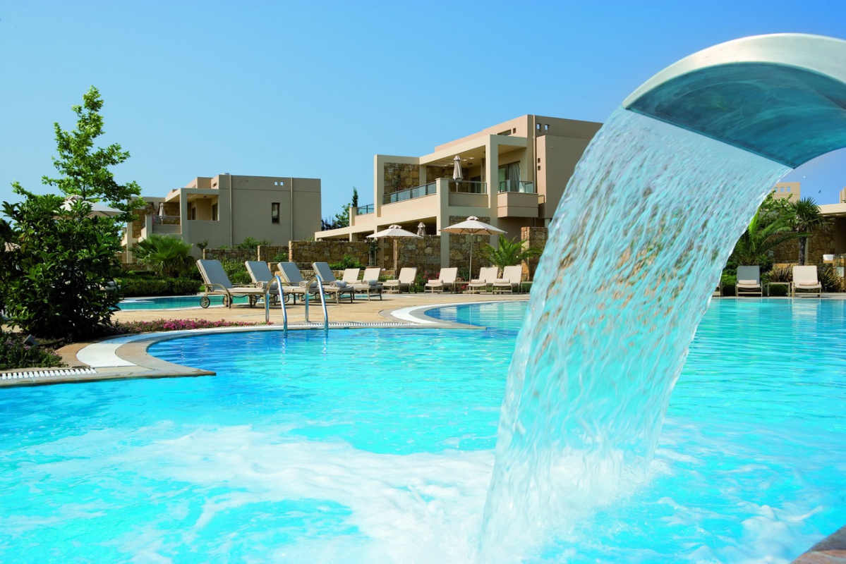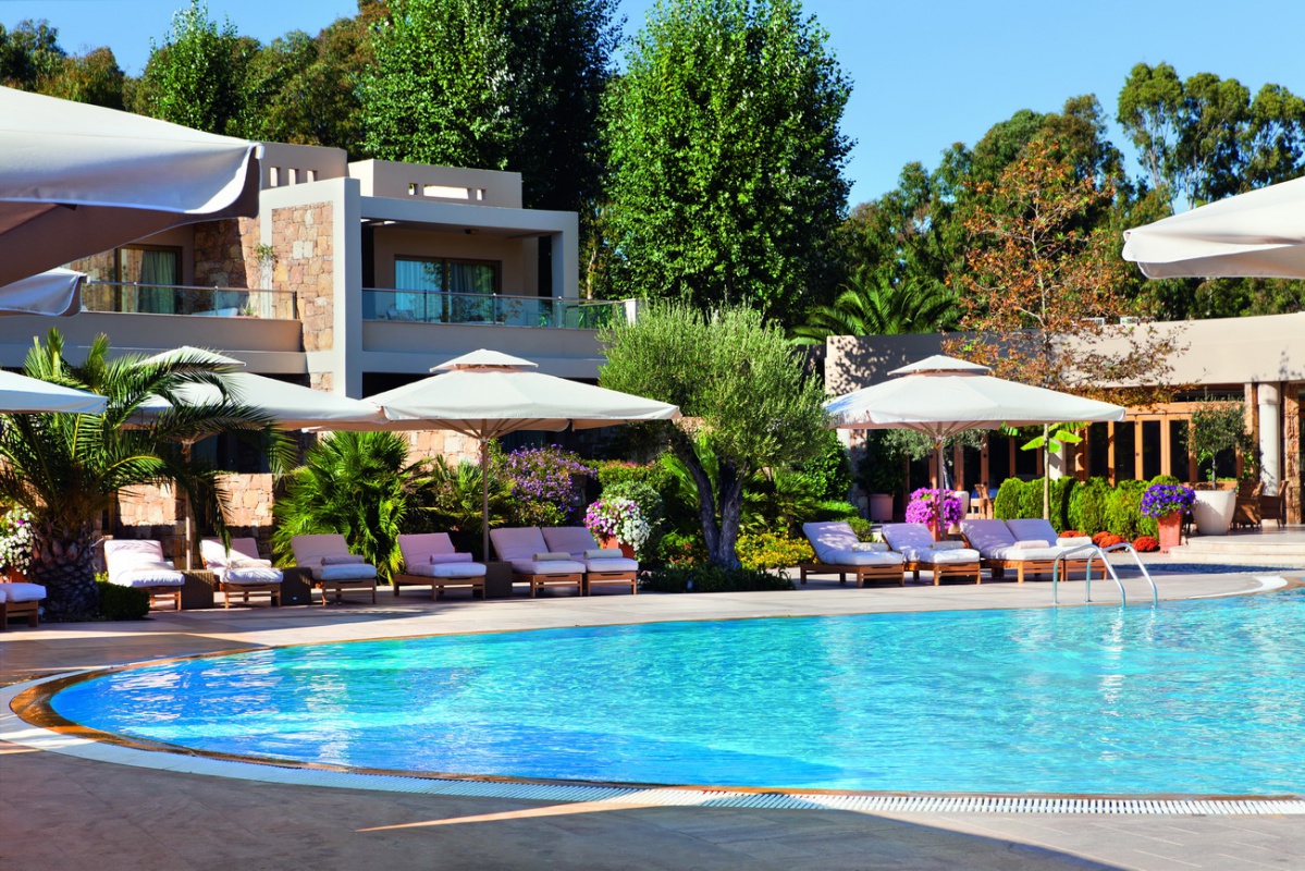 Басейн у формі лагуни з прісною водою (800 м2) і масажуючим струменем, окремий дитячий басейн, а також критий басейн, що підігрівається, в The Spa Suite в готелі Porto Sani Village.