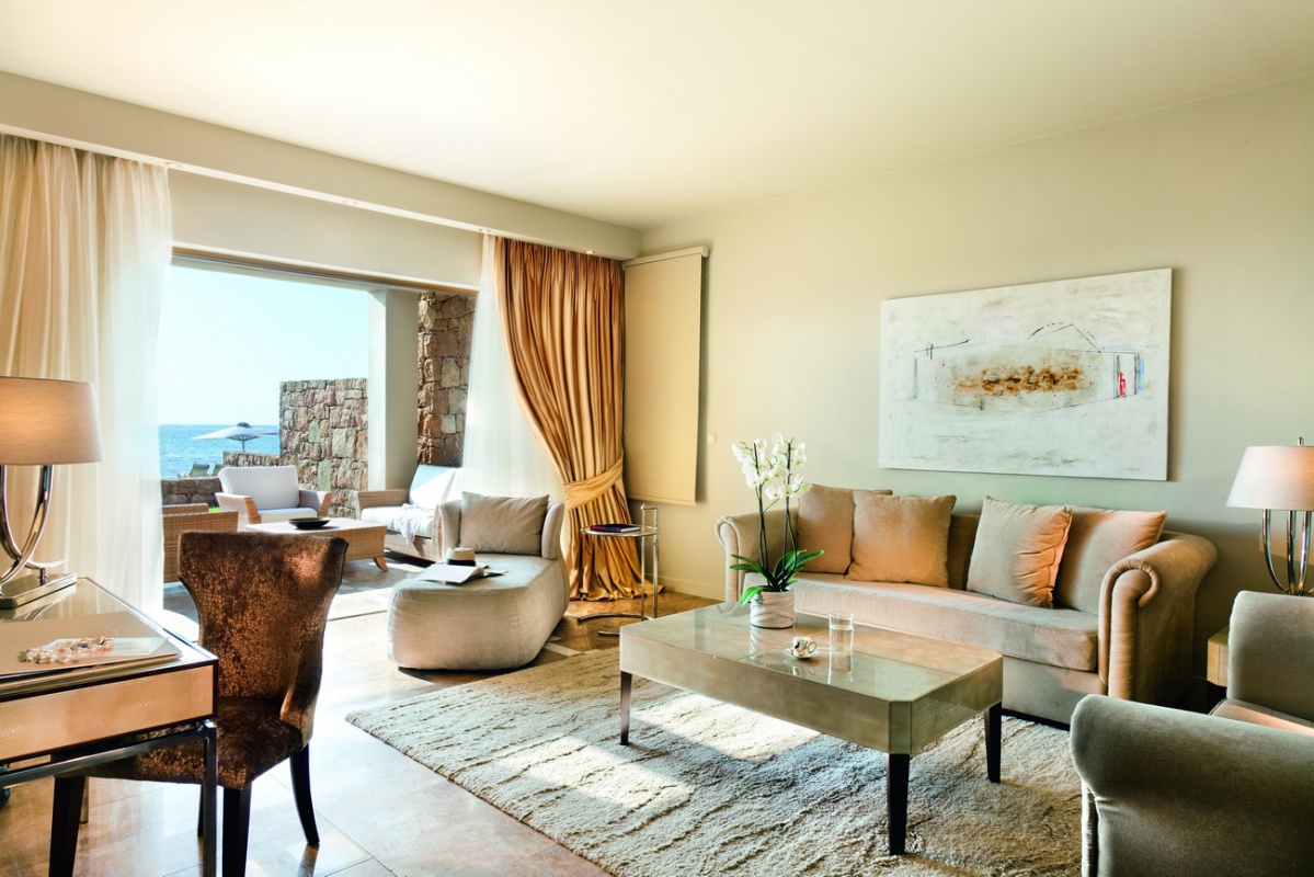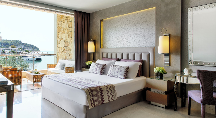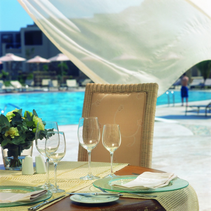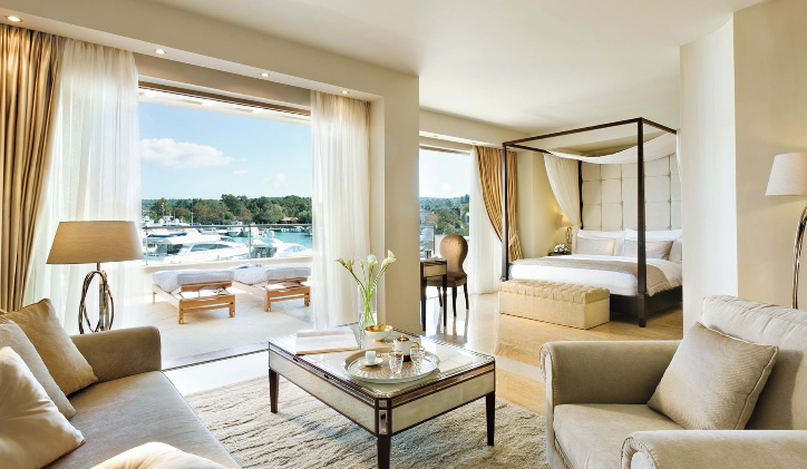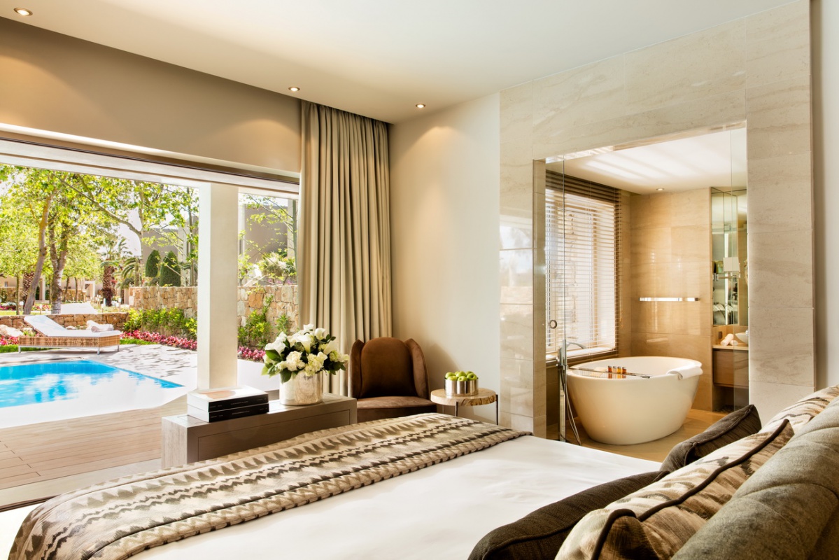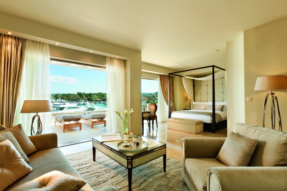 Басейн у формі лагуни з прісною водою (800 м2) і масажуючим струменем, окремий дитячий басейн, а також критий басейн, що підігрівається, в The Spa Suite в готелі Porto Sani Village.
