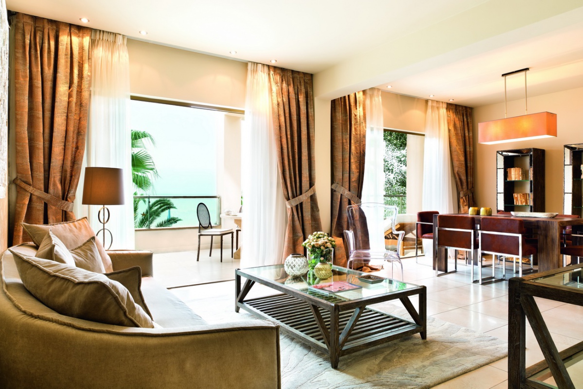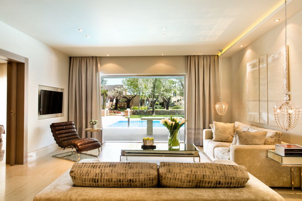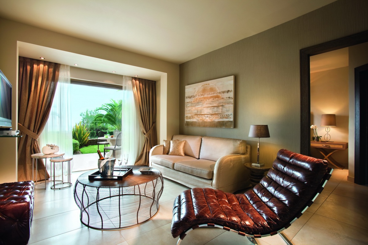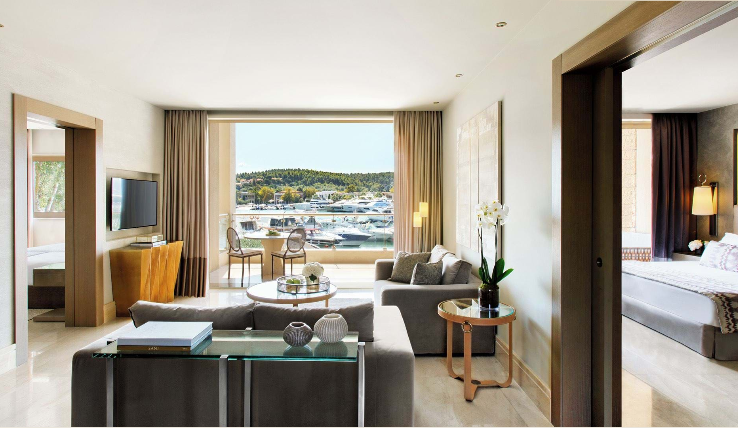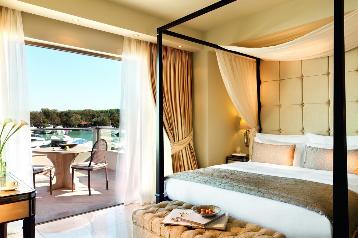 Басейн у формі лагуни з прісною водою (800 м2) і масажуючим струменем, окремий дитячий басейн, а також критий басейн, що підігрівається, в The Spa Suite в готелі Porto Sani Village.