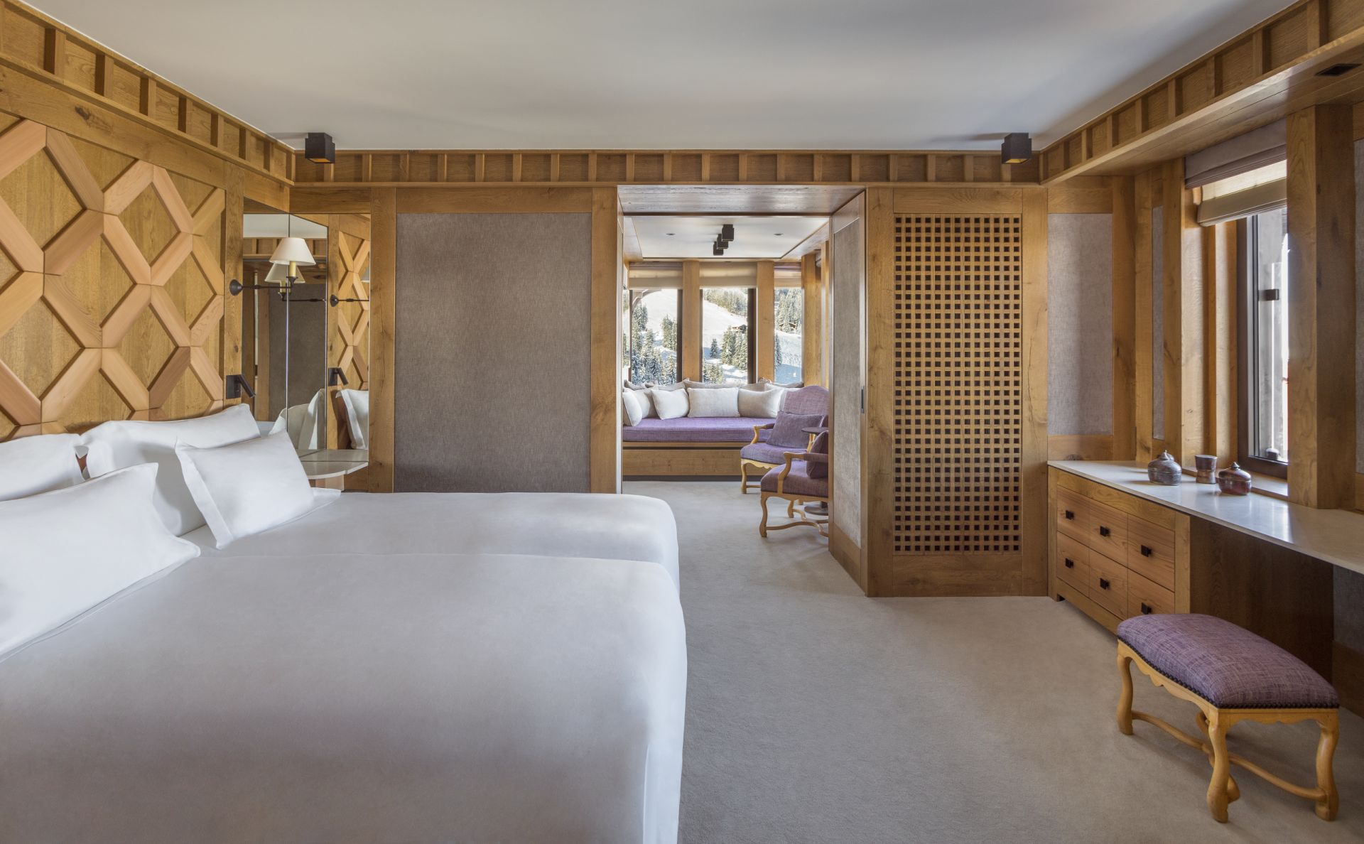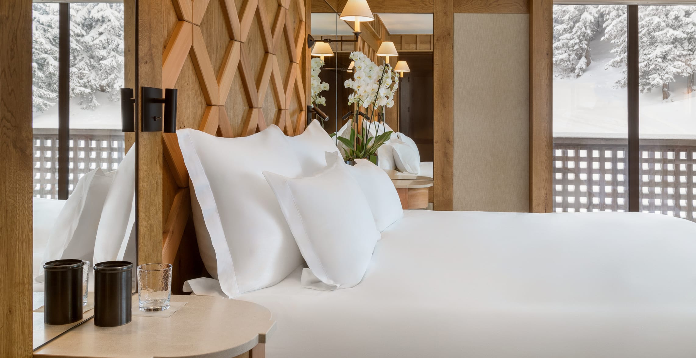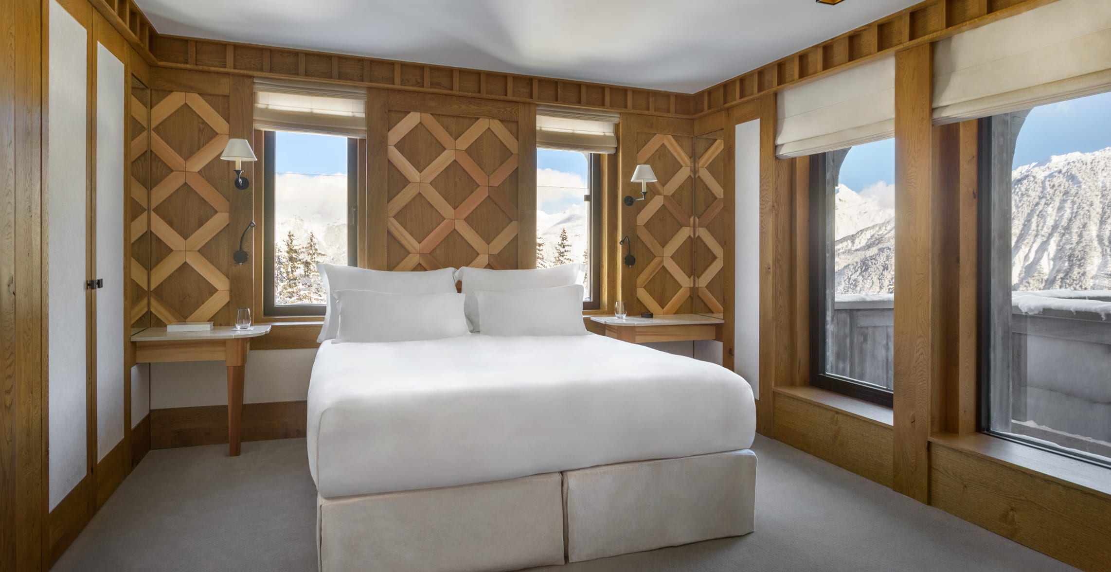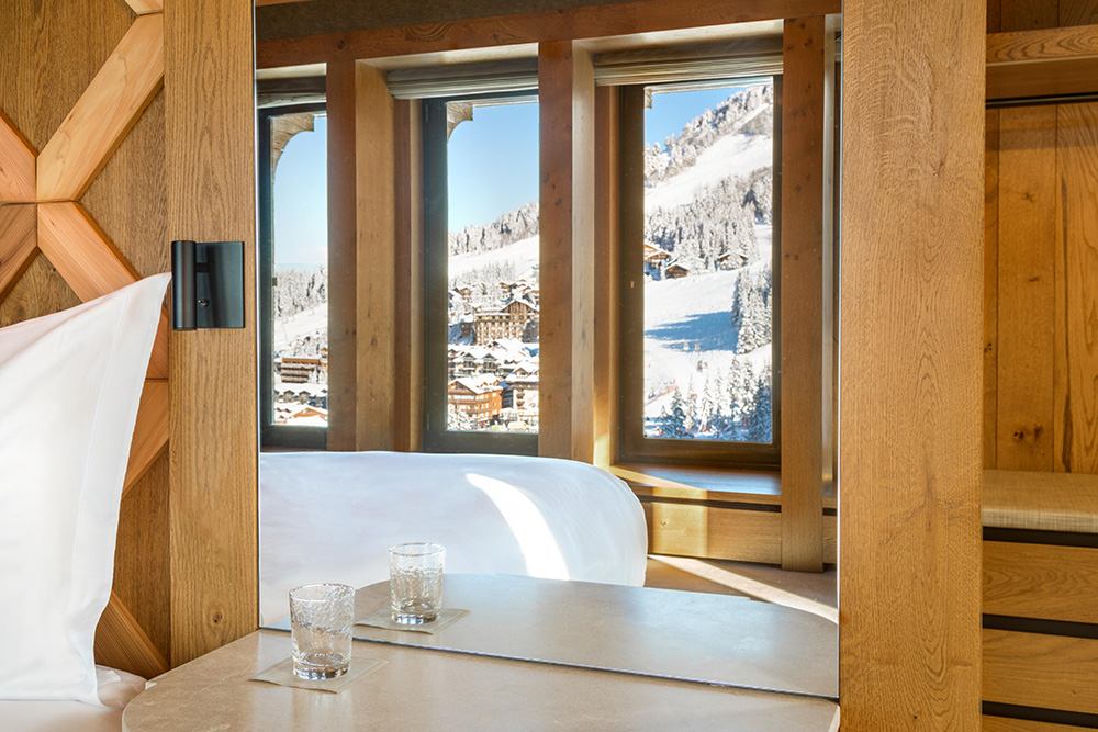 Aman Le Melezin пропонує гостям номери та люкси, з яких відкривається панорамний вид на засніжені вершини, що височіють на тлі чистого альпійського неба.