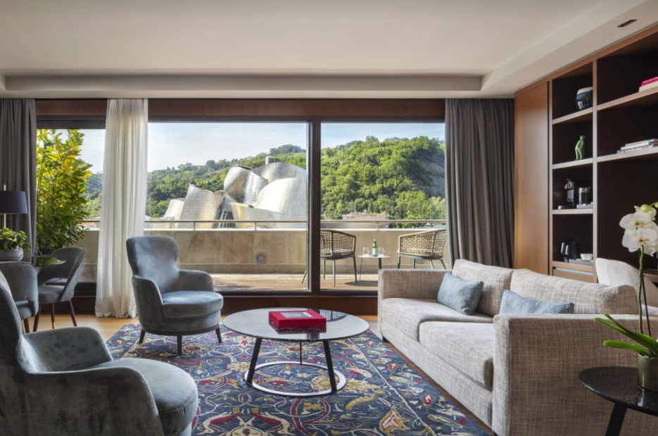 Просторі люкси, поділені на дві кімнати, дозволяють відпочити у затишній вітальні, розслабитися у вашій спальні або насолодитися нашою кухнею на ексклюзивній терасі з неперевершеним видом на музей Гуггенхайма.