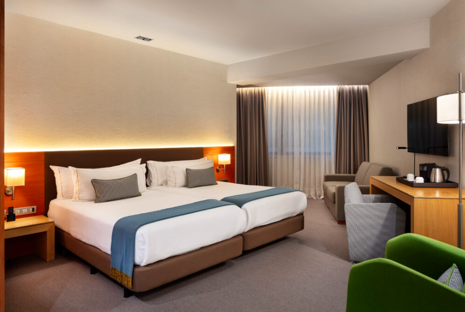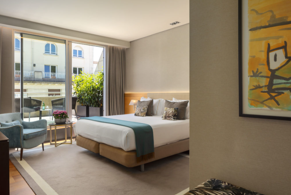 Теплий дизайн і зручність меблів роблять цей номер ідеальним вибором для відпочинку та бізнесу, насолоджуючись приголомшливим видом на кам’яний кипарис Хав’єра Маріскаля в атріумі готелю.