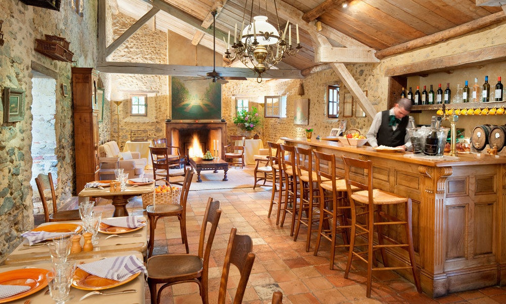 Чудовий ресторан. La Ferme aux Подрібнювачі Традиційні страви подаються з величезним каміном.