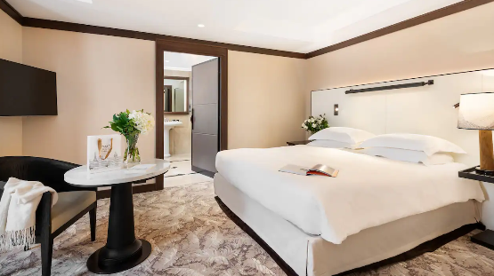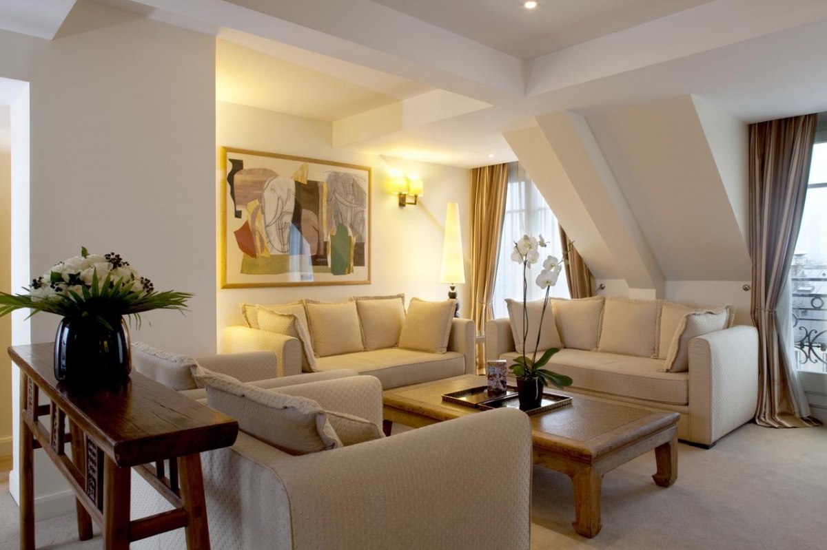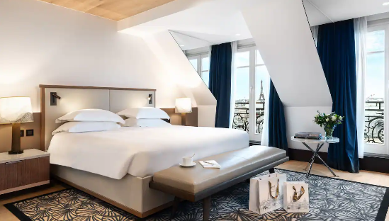Зі спальні, вітальні та ванної кімнати відкривається захоплюючий вид на Ейфелеву вежу. Люкс Eiffel Tower розташований на верхньому поверсі готелю - розкішна та тиха паризька квартира площею 516 фут² (48 м²).