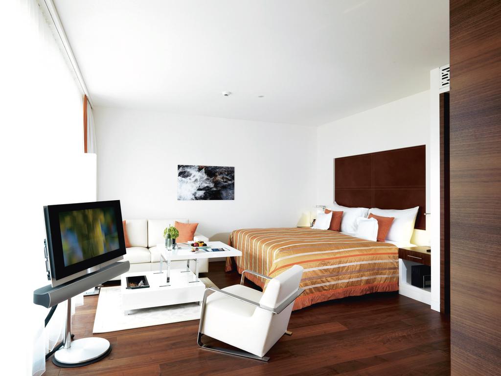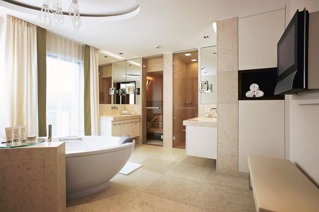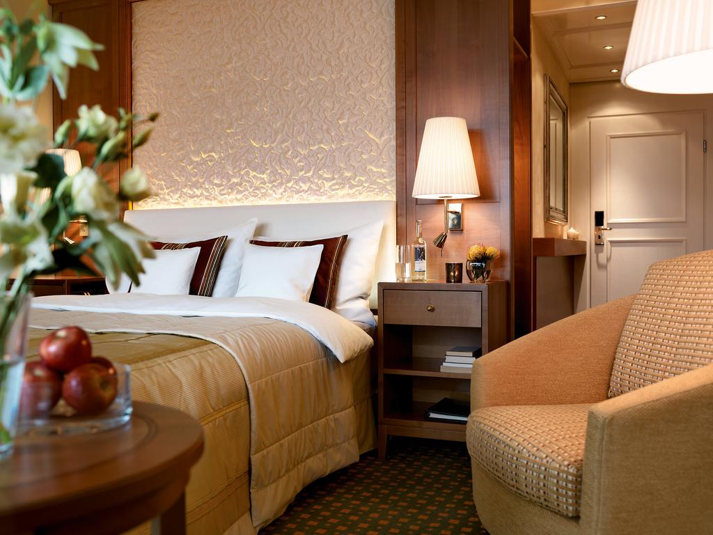 Palais Suite: 73-77 кв.м. Розташований в історичному палаці Palais. Номер виконаний в елегантному сучасному стилі та витриманий у теплих жовто-коричневих тонах, складається зі спальні, вітальні, ванної кімнати, обробленої біло-коричневим мармуром, вид на сад.