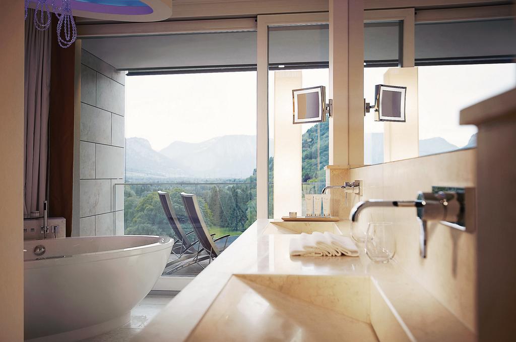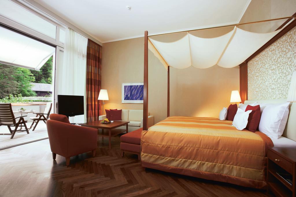 Imperial Suite: 105 кв.м. Розкішний історичний номер, розташований в історичному палаці Palais, прикрашений старовинною ліпниною, інкрустованими паркетними підлогами та вишуканими витворами мистецтва, обставлений меблями у стилі бароко. Включає спальню з ліжком під балдахіном і зоною відпочинку, простору вітальню з обідньою зоною, велику ванну кімнату з ванною, що окремо стоїть, виходить на парк і гори. Можливе з'єднання з іншим номером.
