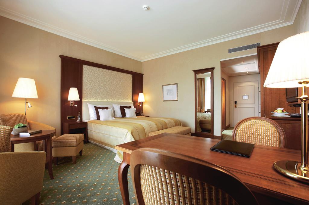 Deluxe Room: 45 кв.м. Номер виконаний в елегантному сучасному стилі та витриманий у теплих жовто-коричневих тонах, у деяких номерах – ексклюзивні паркетні підлоги. Складається із спальні, ванної кімнати, обробленої біло-коричневим мармуром. Частина номерів має балкони з видом на парк або садочок.