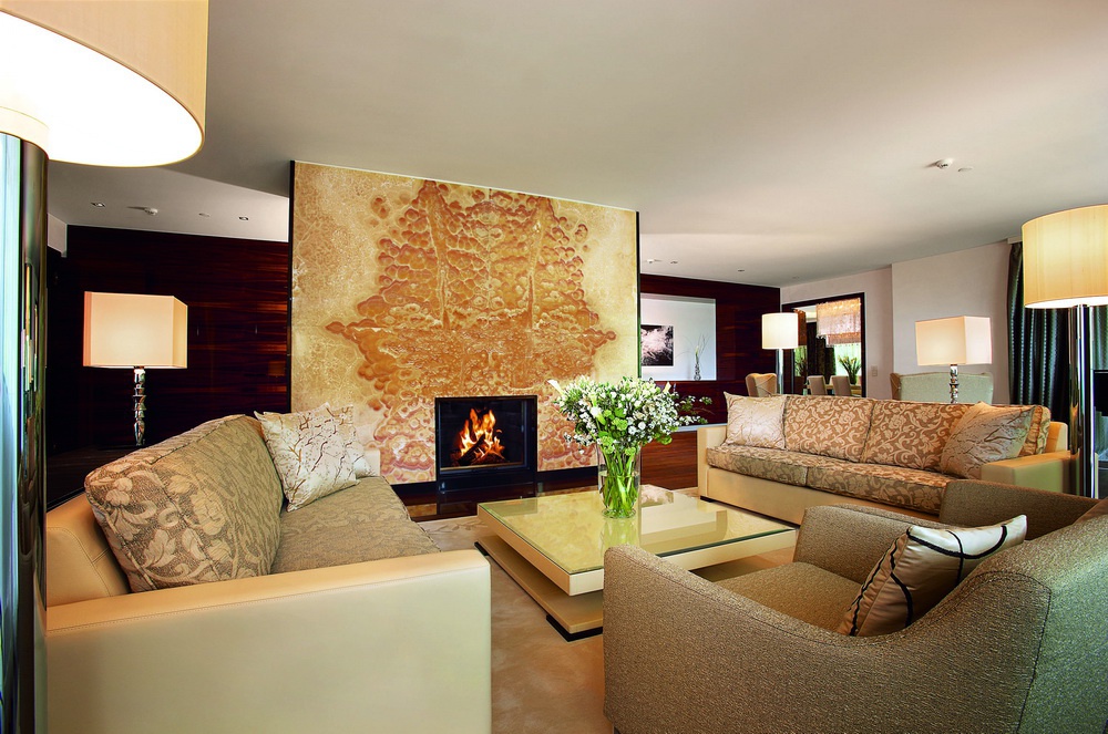 Полулюкс: 200 кв.м. Номер розкіш складається з фена, вітальні з фортепіано, вогнепальної зони, двох спальних кімнат з king-size ліжками, санвузлом, смугастим гранітом, з джакузі і теплою водою, гостьовим туалетом, великим балконом з видом на гори і гольф-поле. Половина вітальні затребувана парком. Може бути підключення до Junior Suite. Гості можуть скористатися послугами палацу.