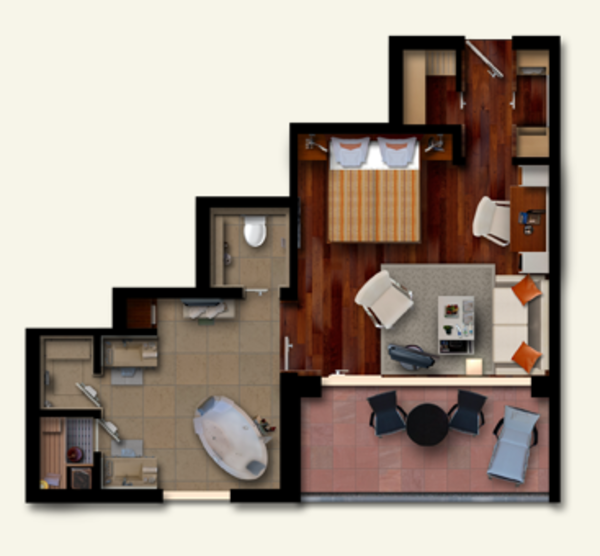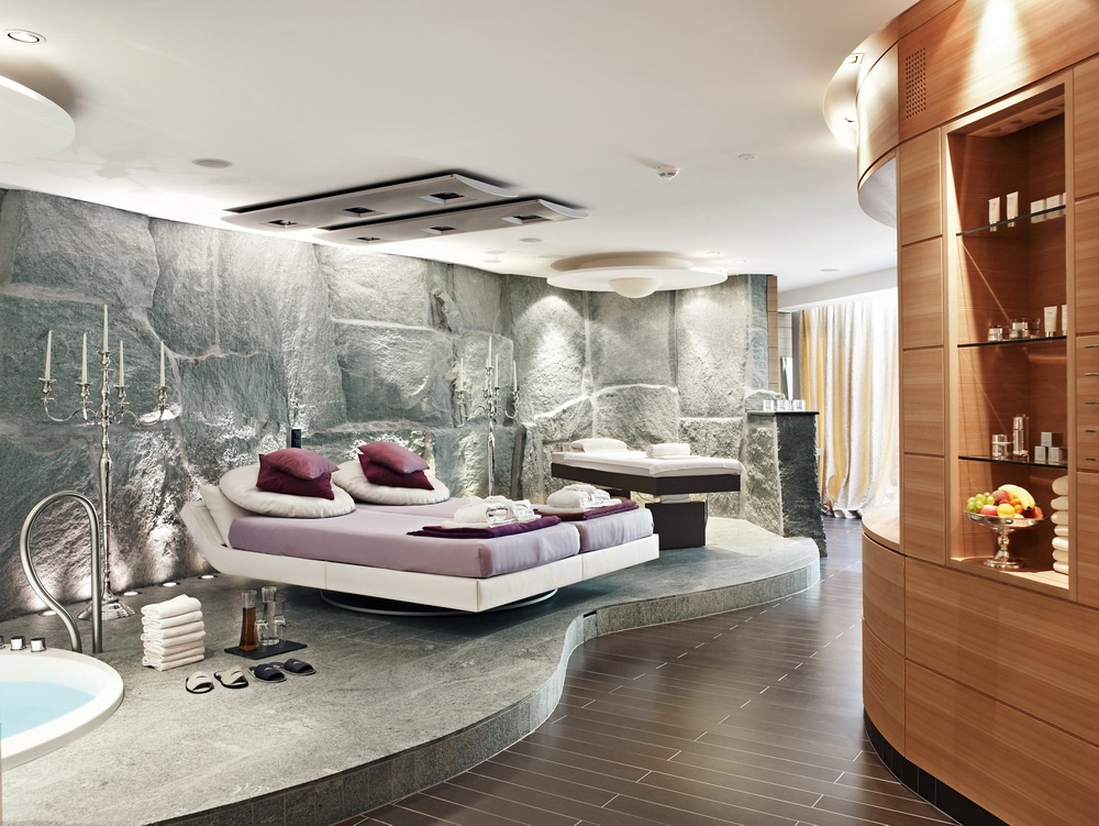 Спа-центр60 кв.м. Новий блискучий open-plane номер, виконаний в сучасному стилі дизайну, з деревними підлогами та шкіряними меблями, розташований від 1 до 4 поверхів. У комплекті спальні з великим ліжком з ергономічним повітряним люксом, зоною відпочинку з BO машиною, harbor, простою ванною кімнатою, відокремленою від спальні скляними дверима і збільшеною Swarovski запальницями, з джакузі, паровою кабіною, теплою водою і вікнами, від зон. У цій категорії є 12 саун. Можливий підключення до Junior Suite або наступного номера дверей Spa Loft.