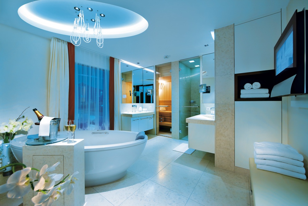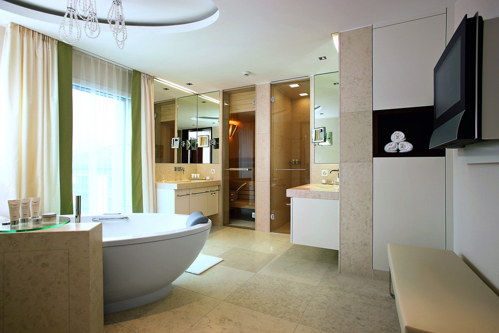 harbor, simplic ванна кімната, відокремлений від спальні скляних дверей і прикрашений Swarovski запальницями, з harbor, jakuzi, сауна, вапурна кабіна, термічна вода і вікна; поділ приміщення з гумкою, гостьова кімната, всі номери з спальним місцем, всі номери мають вихід на шафу. Чи можна підключитися до номеру Spa Suite Superior (з номером, зайнятим на 9 поверсі). Гості можуть скористатися послугами палацу.[Пентхаус Люкс]