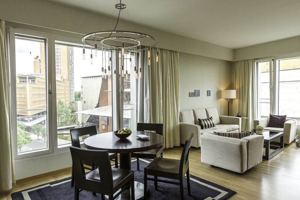 Полулюкс Переглянути король: 69 кв.м1 часй Номер оформлений сучасним мистецтвом, складається з спальні з двоспальним ліжком king-size, ванною кімнатою, гостьовою кімнатою, видом на парк Тіргартен і Берліном Філармонія. Максимальне розміщення 3 осіб. Додаткові послуги надаються Гранд Клубу.