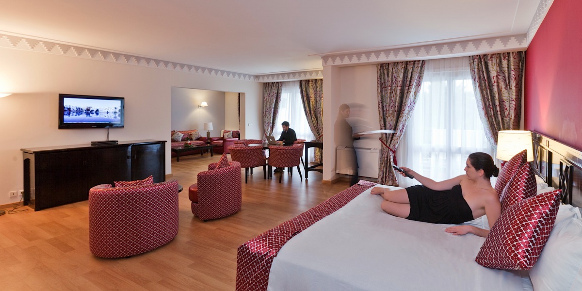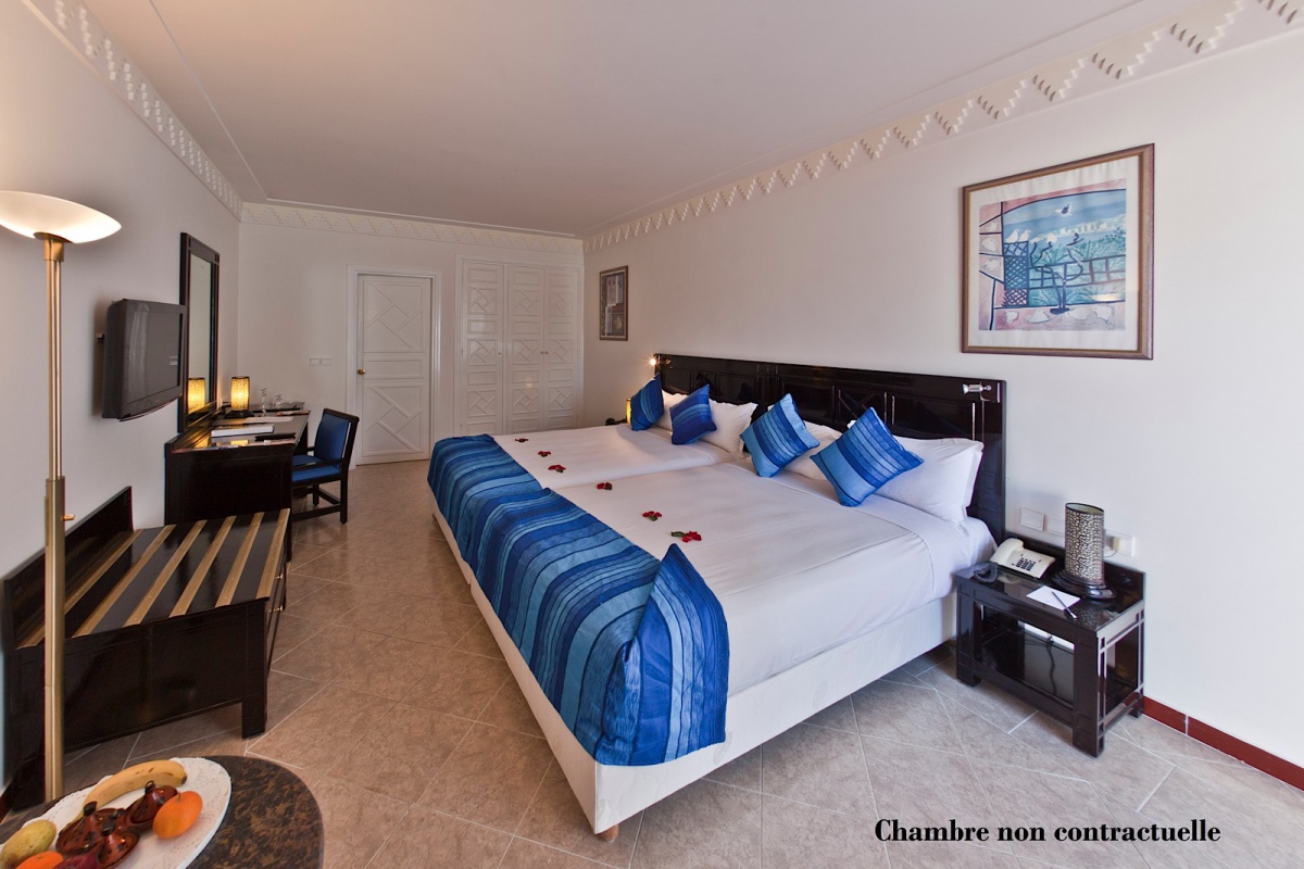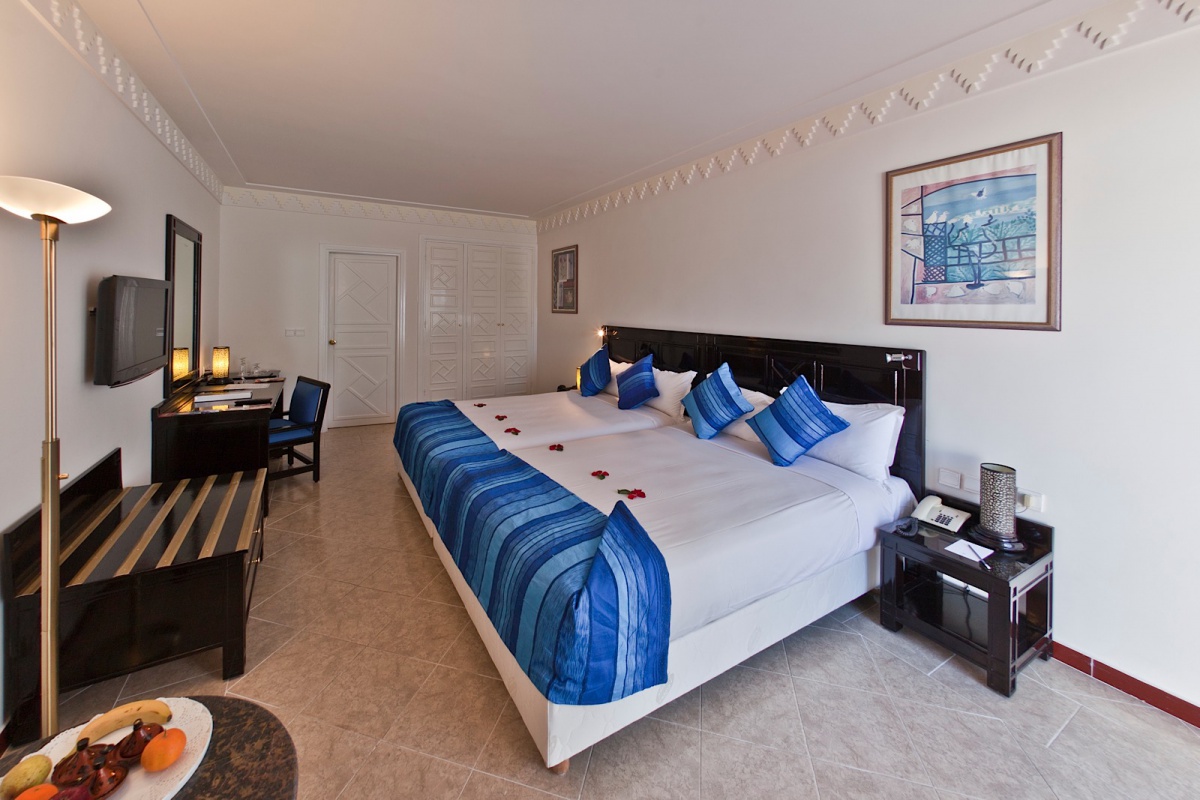 Всі номери включають балкон або терасу, з якою відкривається вид на басейн або сад. Внутрішнє очищення є доповненням до охолоджуючої атмосфери парку з товстими алеями, смарагдовими зеленими деревами і лазурним лагуном, що відображає червоному будинку і навколишній ландшафтний час. Кількість інтерфейсів позначена однаковою грою східної мотивації і марокканського стилю, яка відбивається на східному еру килимів, сантехніки і ковдр, а також у витончених гнучких гнучких меблів, постійного блиску естам і пано.