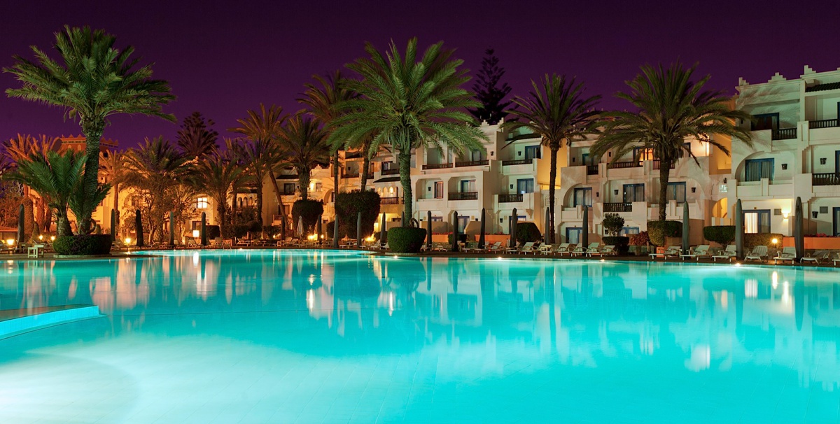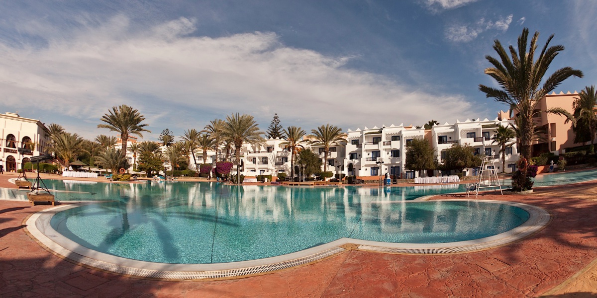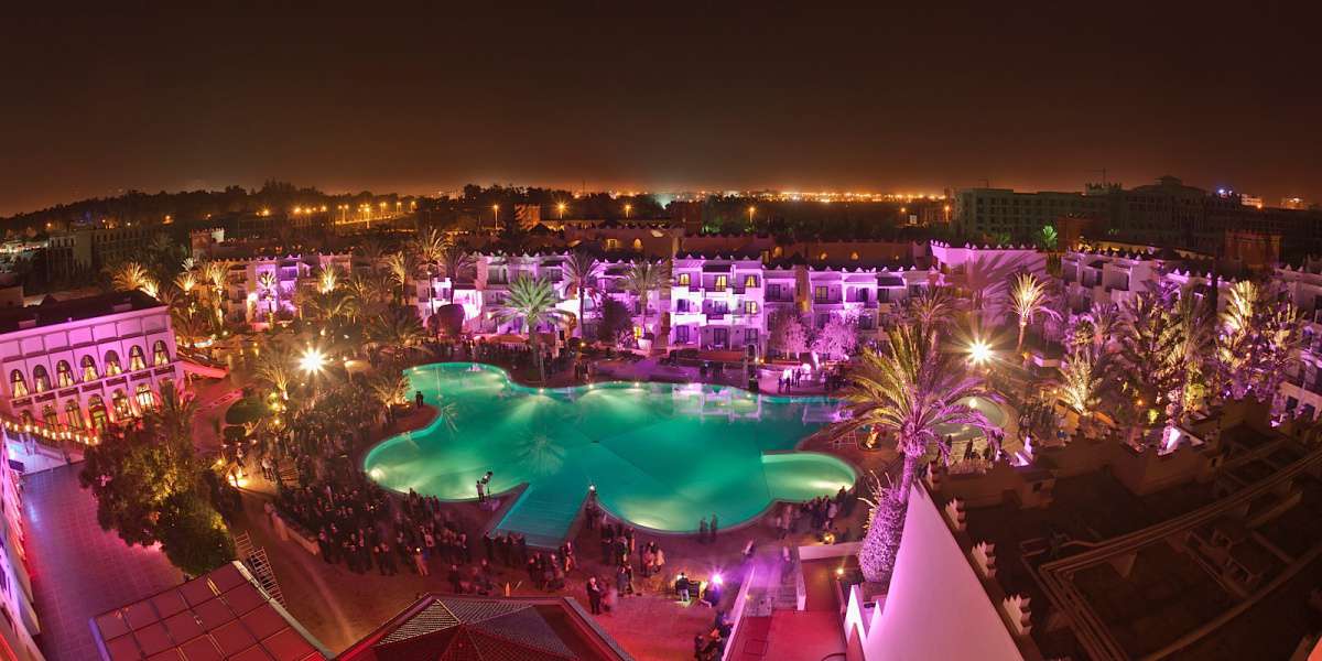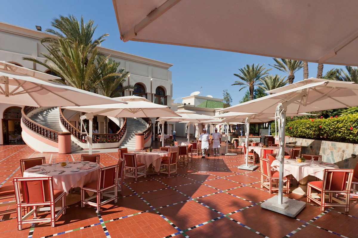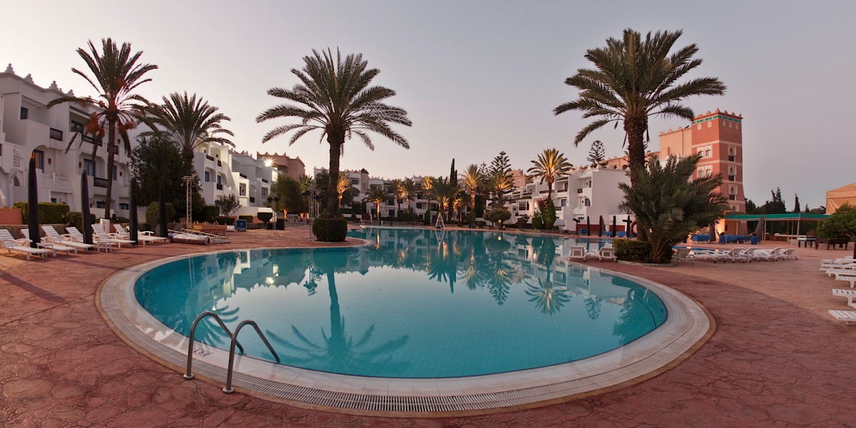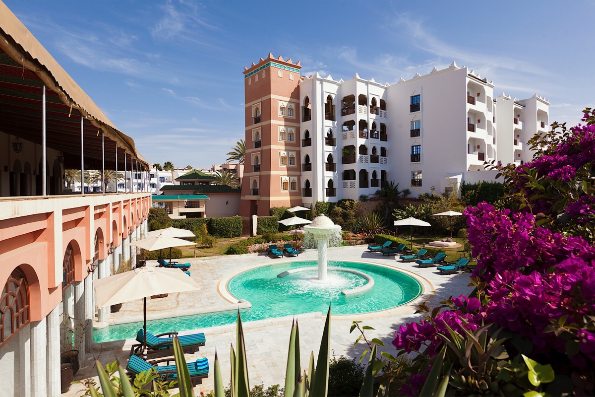 Помешкання розташоване в 10 хвилинах від центра Агадір. Ізольовані паси приголомшливих пальм, вузькі доріжки, шайні бігуни на глибині парку, екзотична рослинність, яка відкриває приголомшливу будівлю в очах розкішних гостей, побудованих під східними палацами в кращих арабських і марокканських традиціях. Неймовірні багатокольорові вежі, розіграційні дуги, фантазії черепахи аркушів, елегантне поєднання сучасних атрибутів екстер'єрів і класичних елементів традиційно пов'язані з арабськими традиціями і мотивами, кожен елемент тут стає частиною однієї танталю, яка захоплює її первазивний, червоний і пофарбований з білого, підігніть цю славу і комфортабельні номери готелю в минулому.