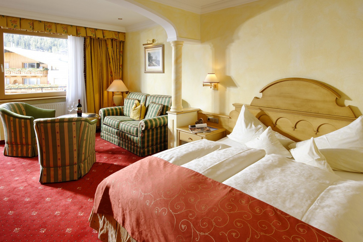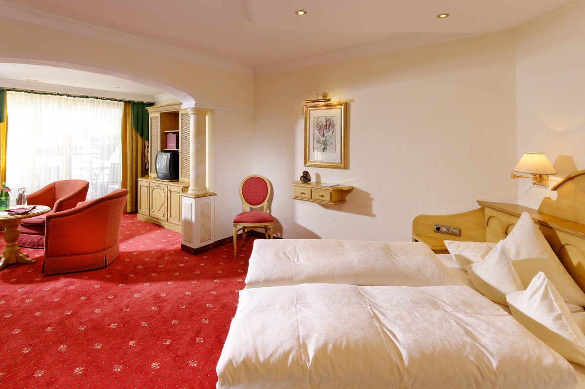 Полулюкс♪ Площа між 30 і 35 м2. Номер складається з спальні з двоспальним ліжком і зоною відпочинку, ванної кімнати. Постільні плити на 1-му поверсі мають велику терасу з розеткою саду, плити на верхніх поверхах мають балкон з видом на гору і санвузлом з окремим туалетом.
