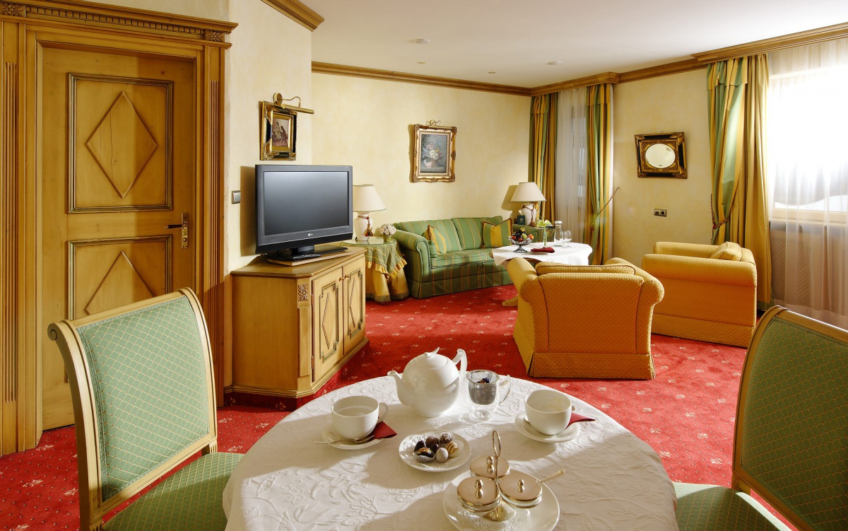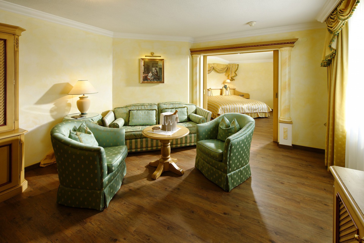 Люкс Максимільян♪ Площа між 45 і 50 м2. Номер складається з спальні з двоспальним ліжком, вітальнею і обідньою зоною, санвузлом, окремою туалетною кімнатою, терасою з видом на гору.