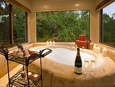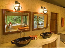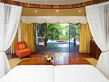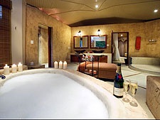 Кожен бунгало має просту спальню з ліжком під базиліком, величезною ванною кімнатою, диким каменем з розкішним банним ліжком посередині і з життєздатною комірною стінкою вікон, відкритою подвір'ям з приватним джакузі басейном і сонячною зоною ванни.