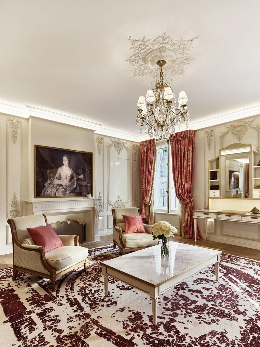 75 кв. м. Витончений суперлюкс складається зі спальні з ліжком розміру king-size або двох ліжок розміру twin, вітальні з розкішними меблями та 2 мармурових ванних кімнат з глибокою ванною та окремою душовою кабіною, передпокою. Доступне бронювання додаткового спального місця, дитячого ліжечка. Вид на готельний внутрішній двір або Рю де Кастільйон. Розміщення: 3 особи.