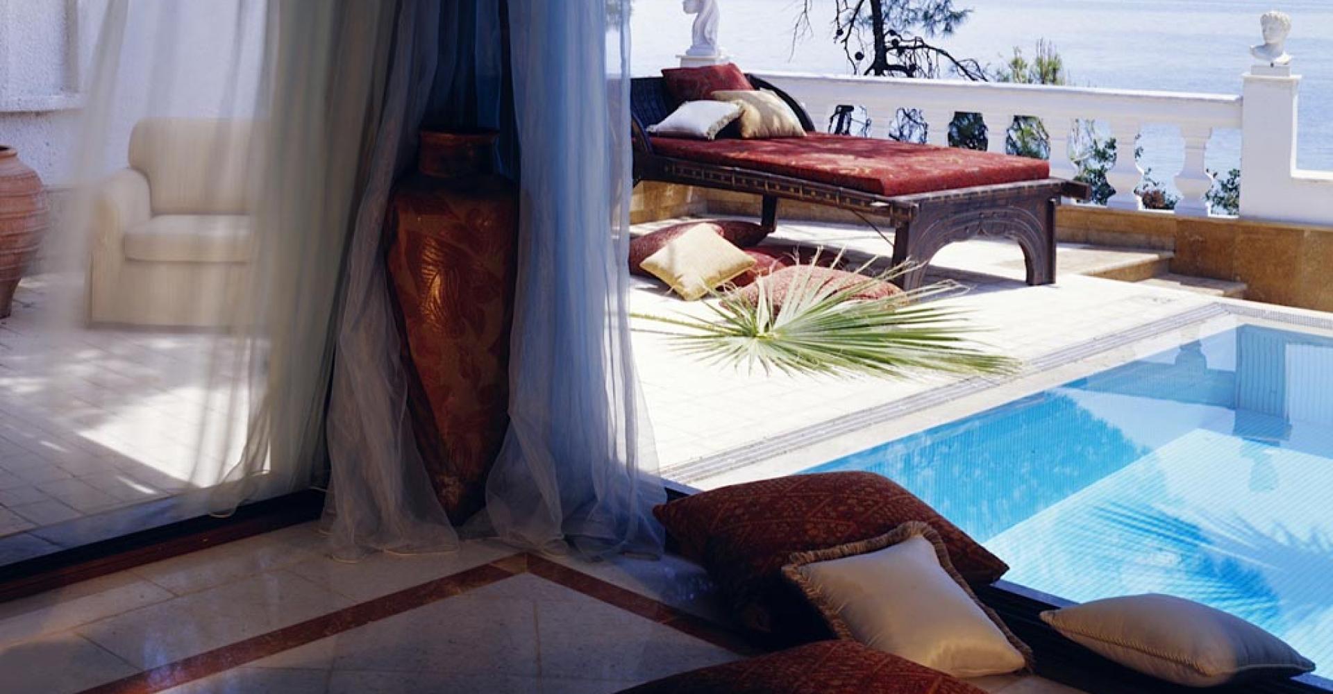 450 кв. Розкішна дворівнева вілла з басейном (підігрівається і освітлюється в нічний час), з якого відкривається вид на море і сад. Вілла складається з просторої вітальні, де представлені роботи відомих дизайнерів та предмети мистецтва, їдальні, 2 спалень з великими двоспальними ліжками, одна зі спалень з каміном з білого мармуру в неокласичному стилі, прикрашеному кришталевими свічниками в стилі ар-деко та чудовим дзеркалом ручної роботи, 2 ванних кімнат з кольорового мармуру з ванними та гідромасажними душами. Величезна тераса має зелені зони і шезлонги для відпочинку. Розміщення: 4 особи.
