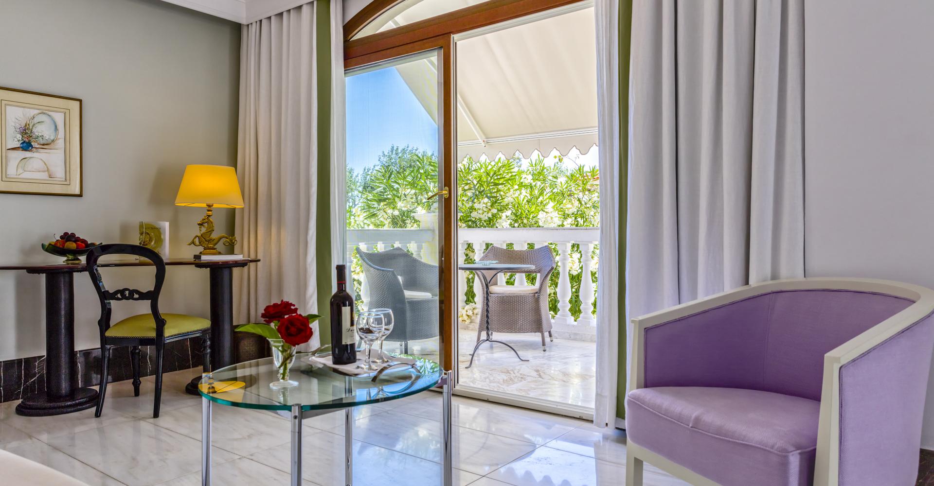 35-40 кв. м. Номер складається зі спальні з великим двоспальним ліжком і просторої вітальні, мармурової ванної кімнати з ванною (у деяких номерах є окремий душ), балкона або тераси з зоною відпочинку. Розміщення: 2 особи.