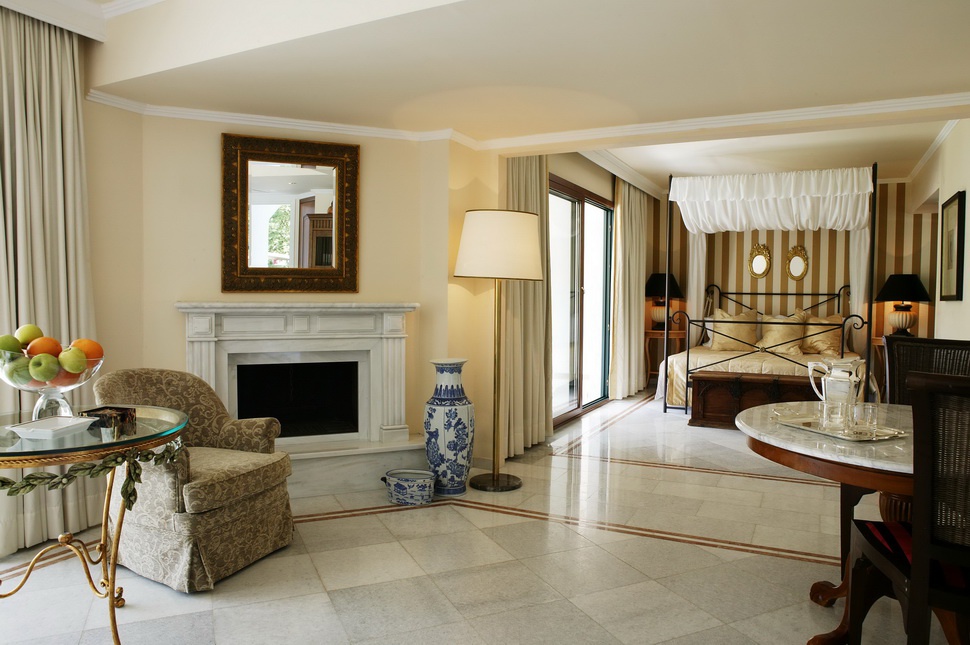 75 кв. м. Шикарний люкс складається зі спальні з великим двоспальним ліжком, вітальні відкритого плану з мармуровим каміном, двох мармурових ванних кімнат (одна з них з окремим душем і вбиральнею), тераси з зоною відпочинку. Розміщення: 2 особи.