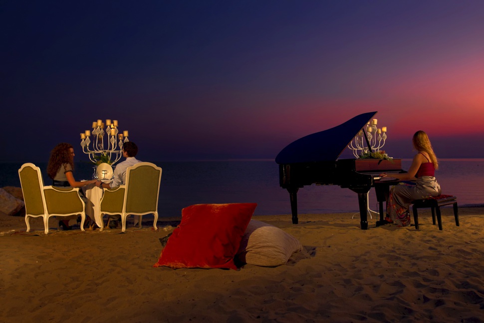 55-60 кв. м. Романтичний люкс складається зі спальні з великим двоспальним ліжком, зони відпочинку, яка відокремлена від тераси скляною стіною, ванної кімнати з ванною та душем. З просторої мебльованої тераси з басейном, що підігрівається, відкривається вид на маленький приватний садок і море. Розміщення: 2 особи.