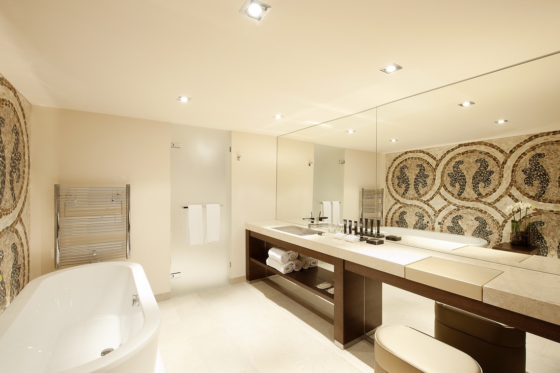 Розкішний готель Люкс Українська Канальний перегляд (52 квадратних метрів) - вид інтер'єру двору; подрібнюється в червоних і сірих тонах; кожен номер має окрему форму; складається з ліжка зі спальним місцем, ванної кімнати з ванною і душем.