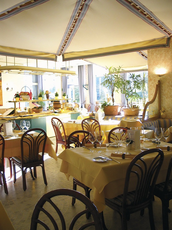 Ресторан і бар Ле-Бордин в оточенні середземноморської атмосфери, тераса для засмаги відкривається влітку, сповнена квітів.