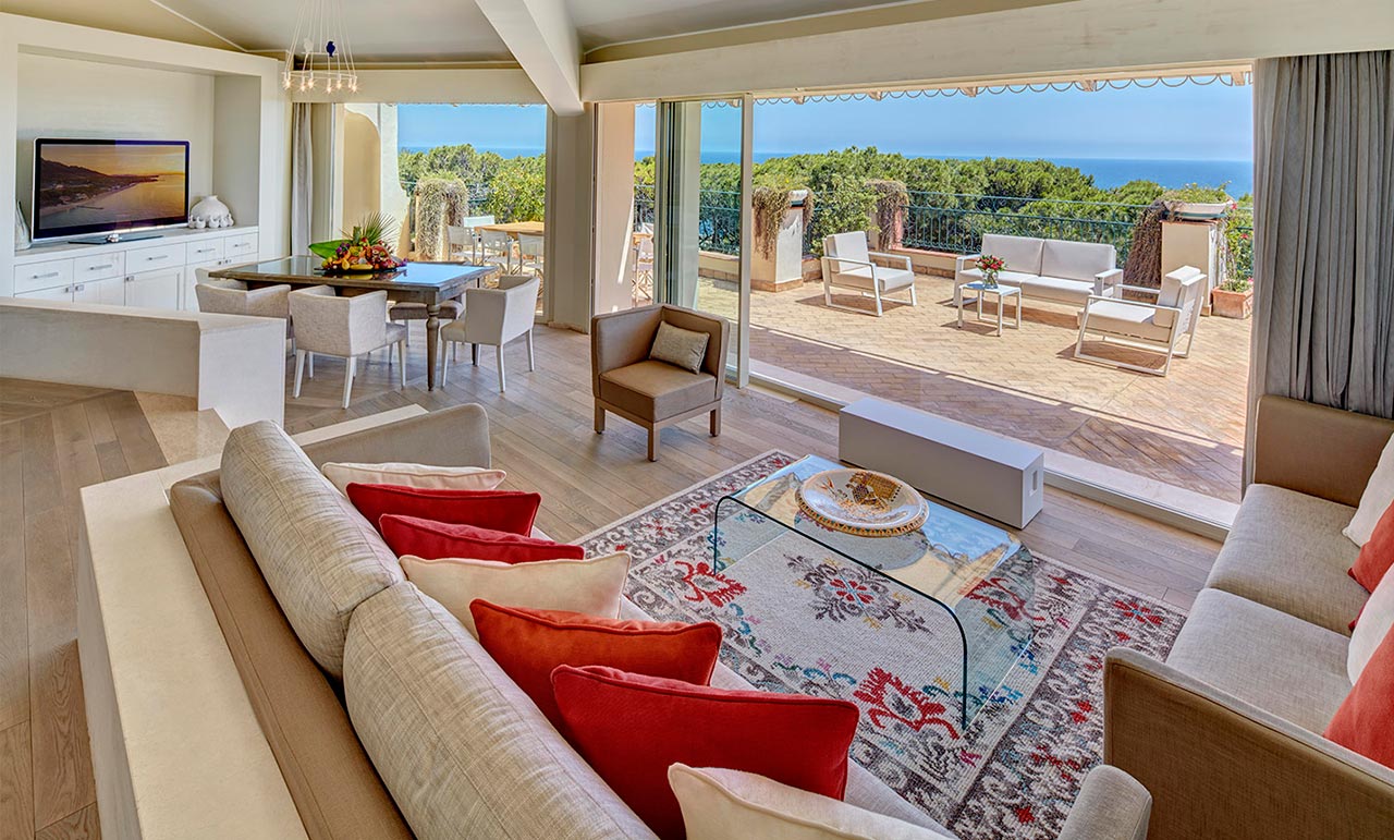 95 кв. м. Прекрасний люкс з видом на гори та море складається зі спальні відкритого плану з двома двоспальними ліжками, яка знаходиться на невеликому піднесенні відносно затишної вітальні, ванної кімнати з джакузі та душем, двох терас загальною площею 20 кв. м та просторого солярію.