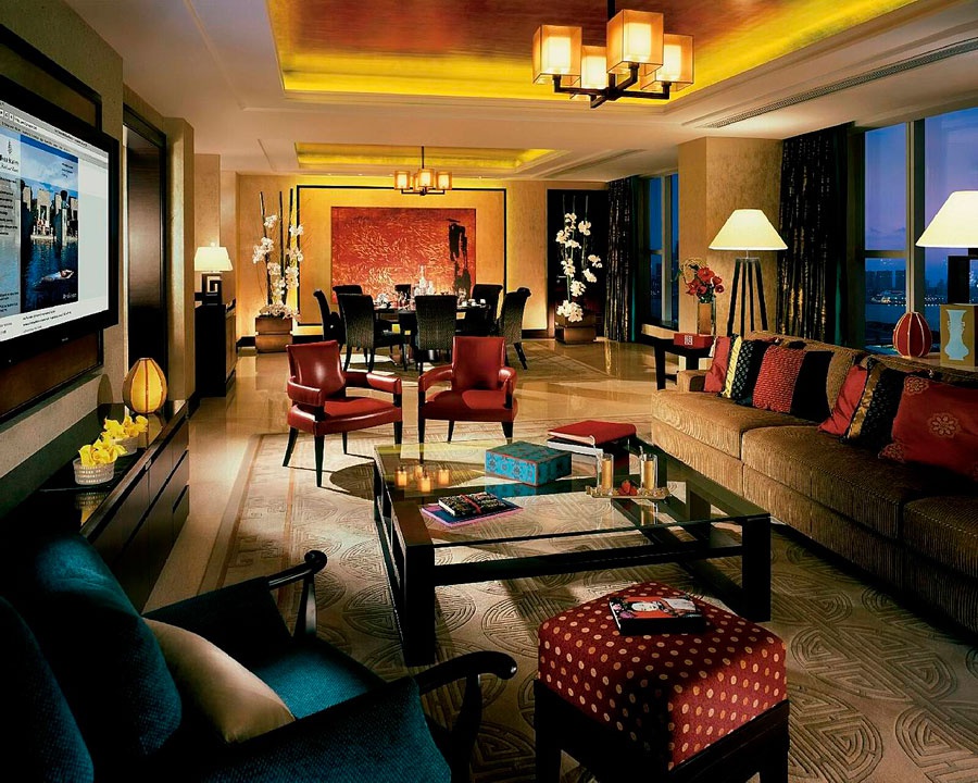 Полулюкс(228 кв. м) знаходиться на 42 поверхах; вид на гавань Вікторія та Кельн; складається з спальні, гостьової кімнати з письмовим столом, гостьовою кімнатою, гостьовою кімнатою з 8 гостями, букетом і санвузлом з ванною та душовою кабіною. Яскрава гамма, натуральні відтінки і дерево підкреслюють екзотичне поєднання сучасних і азіатських стилів. Три людини.