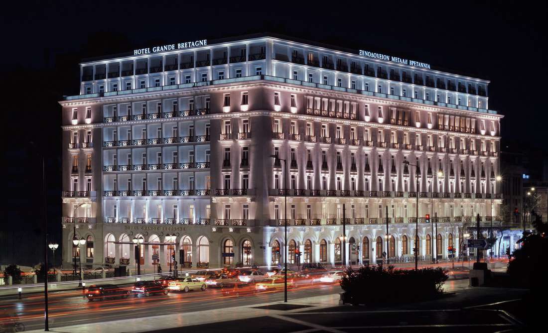 Величний маєток The Grande Bretagne розташований у самому центрі Афін, на знаменитій площі Конституції, поряд з Акрополем, Національними садами, історичним районом Плака та іншими визначними пам'ятками міста. Відкритий у 1874 році, готель зайняв значне місце у соціальному, економічному та політичному житті Афін, а можливо, і всієї Греції — тут проходили важливі міжнародні зустрічі та перемовини, у його стінах побували глави багатьох держав, королівські особи, фінансові магнати, всесвітньо відомі актори, музиканти, діячі культури.