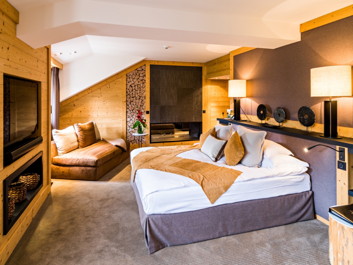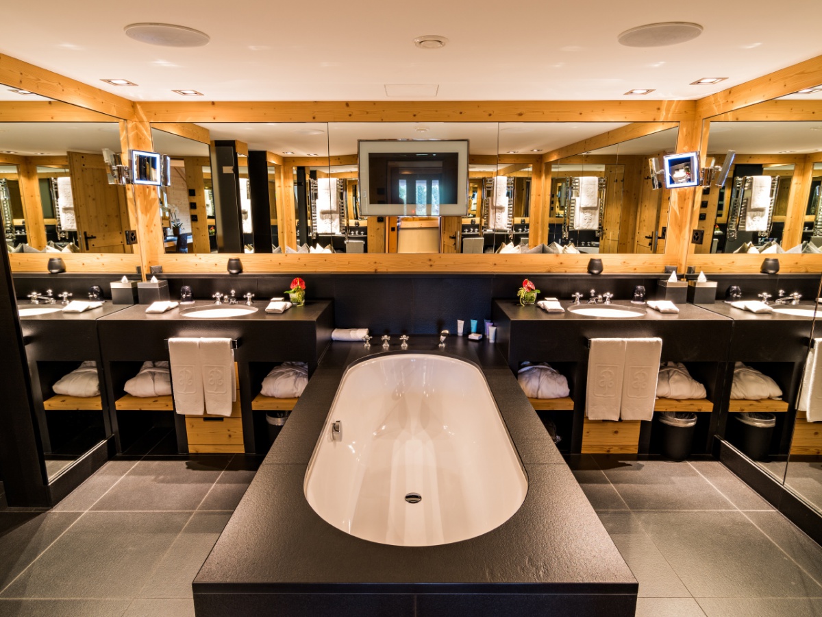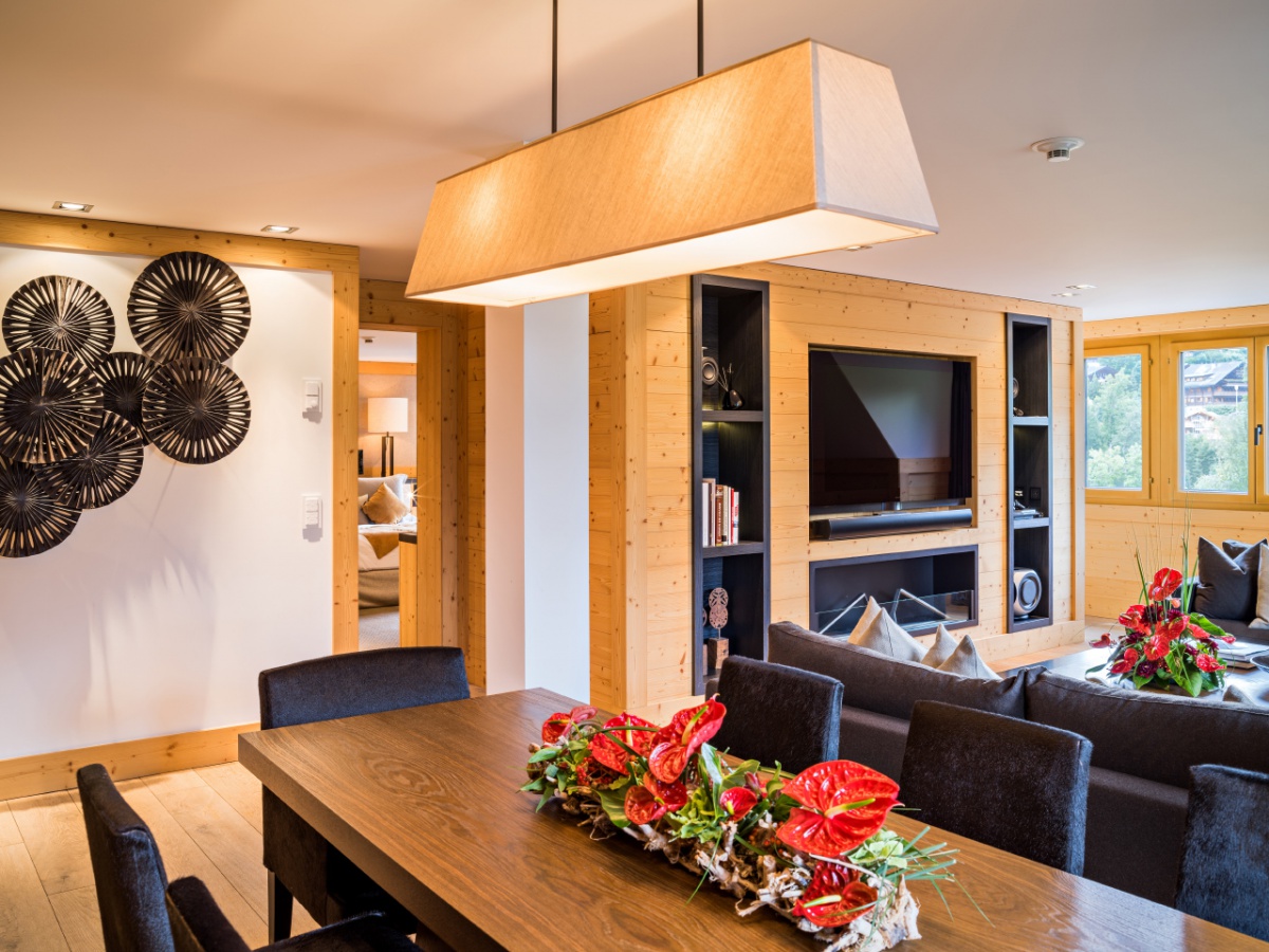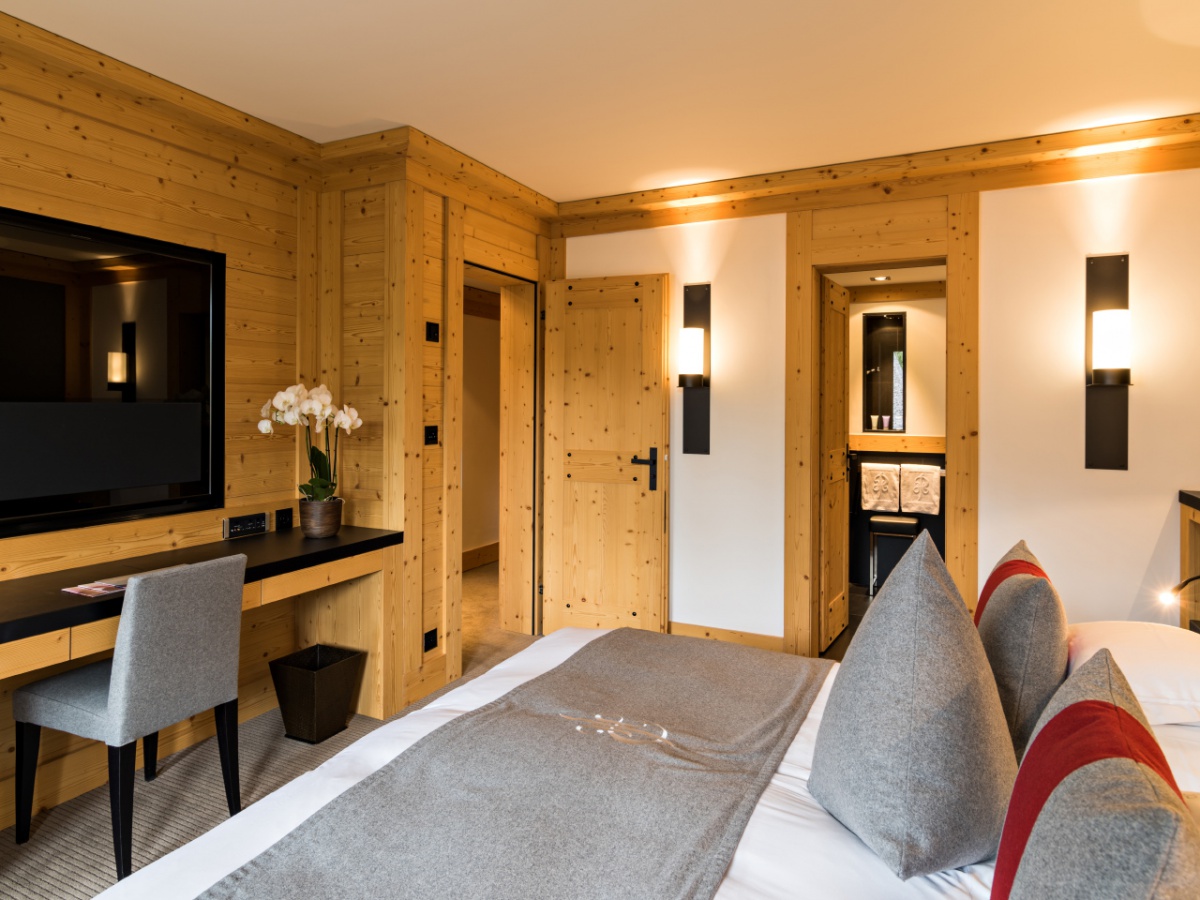 My Gstaad Chalet: 400 кв.м. Розкішний номер, розташований на двох верхніх поверхах готелю, складається з 4 спалень, вітальні з каміном, їдальні, кухні, ванних кімнат, персонального СПА з сауною, парною, джакузі та масажною зоною, балкона з видом на гори. Гостям номера надаються послуги персонального дворецького.