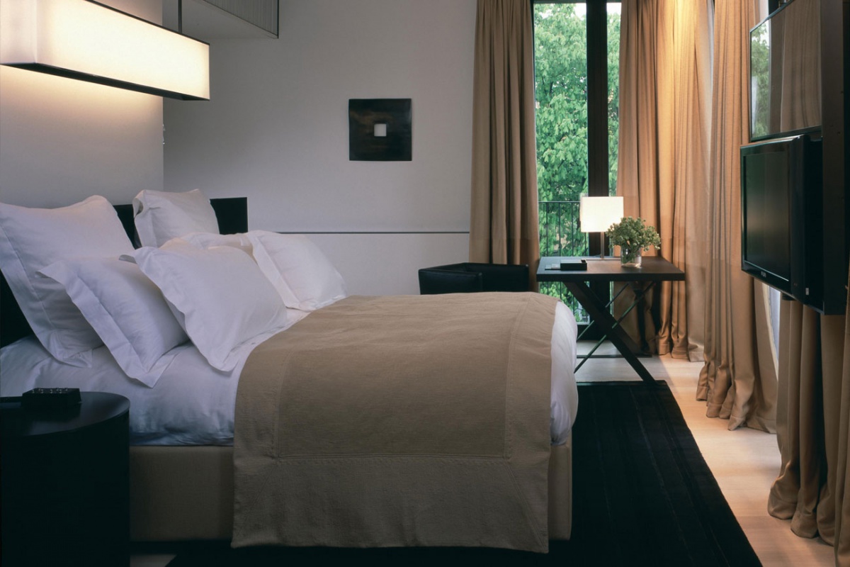 У номерах Делюкс є простора гардеробна, зручне ліжко розміру "king-size" або 2 ліжка розміру "queen-size". Буазері зі світлого дуба, лляний гобелен кремового кольору та велика світла ванна кімната з ванною з чорного граніту та окремим душем із білого травертину Navona. Ці номери виходять або на прекрасний сад, або на чарівний міланський дворик. 40 кв.м.