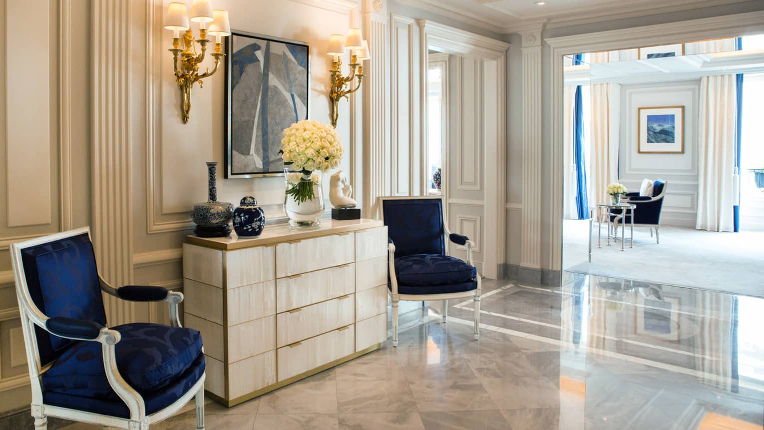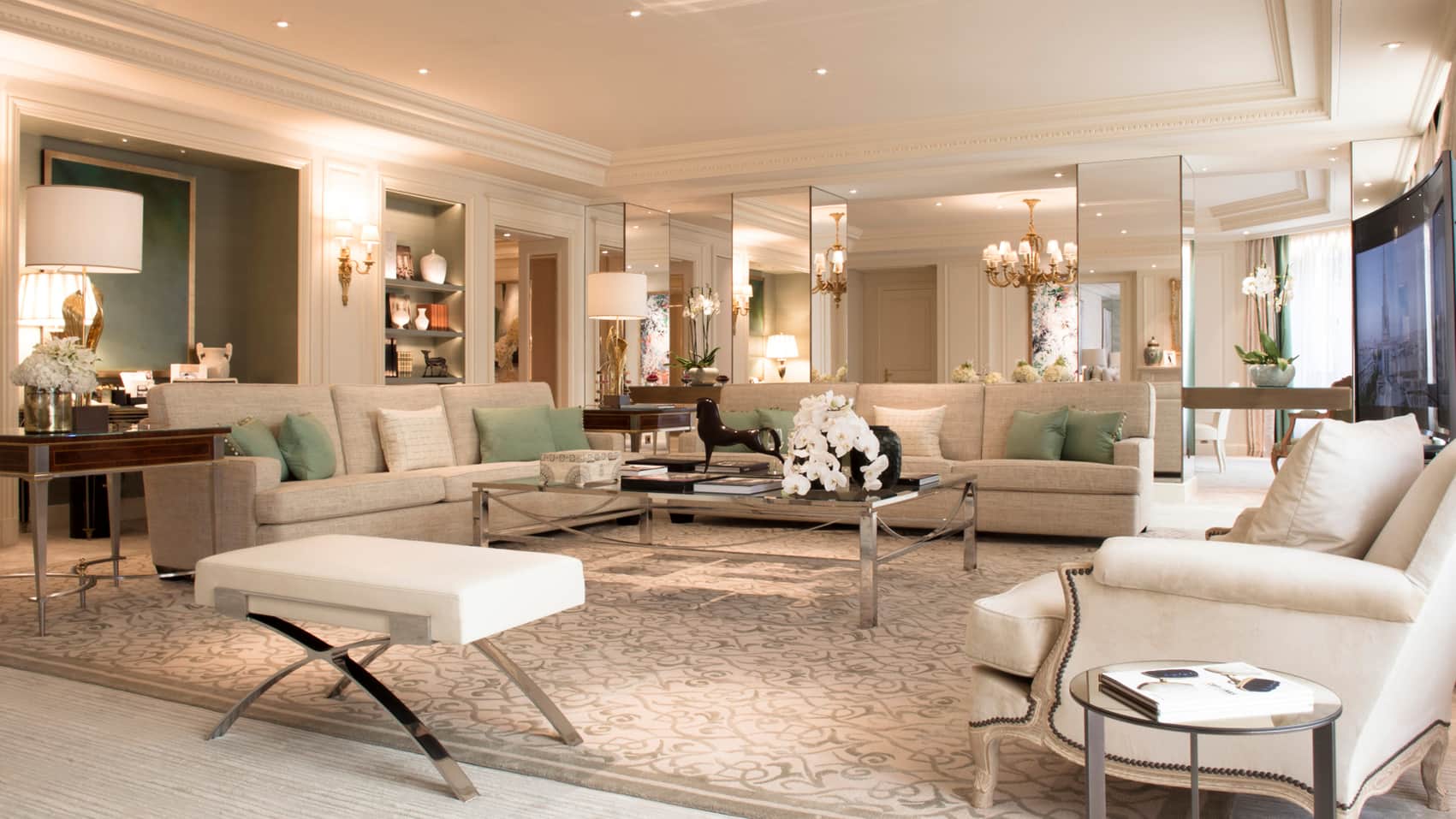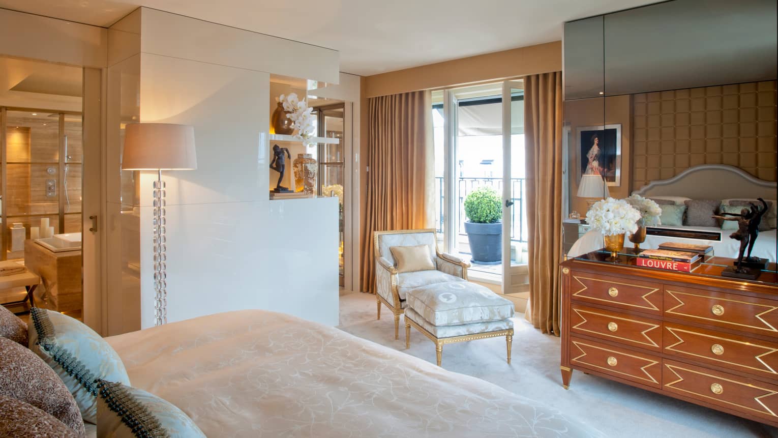 140 кв. м. Стильний люкс розташований на 4-му поверсі і складається з 1-ї або 2-х спалень, просторої вітальні, гардеробної, 1-ї або 2-х мармурових ванних кімнат з ванною та окремою душовою кабіною, гостьового туалету, повністю обладнаної кухні, мебльованого балкону. З номера відкривається чудовий краєвид на Avenue George V і Мармуровий двір. Максимальне розміщення: 4 дорослих або 2 дорослих та 2 дітей.