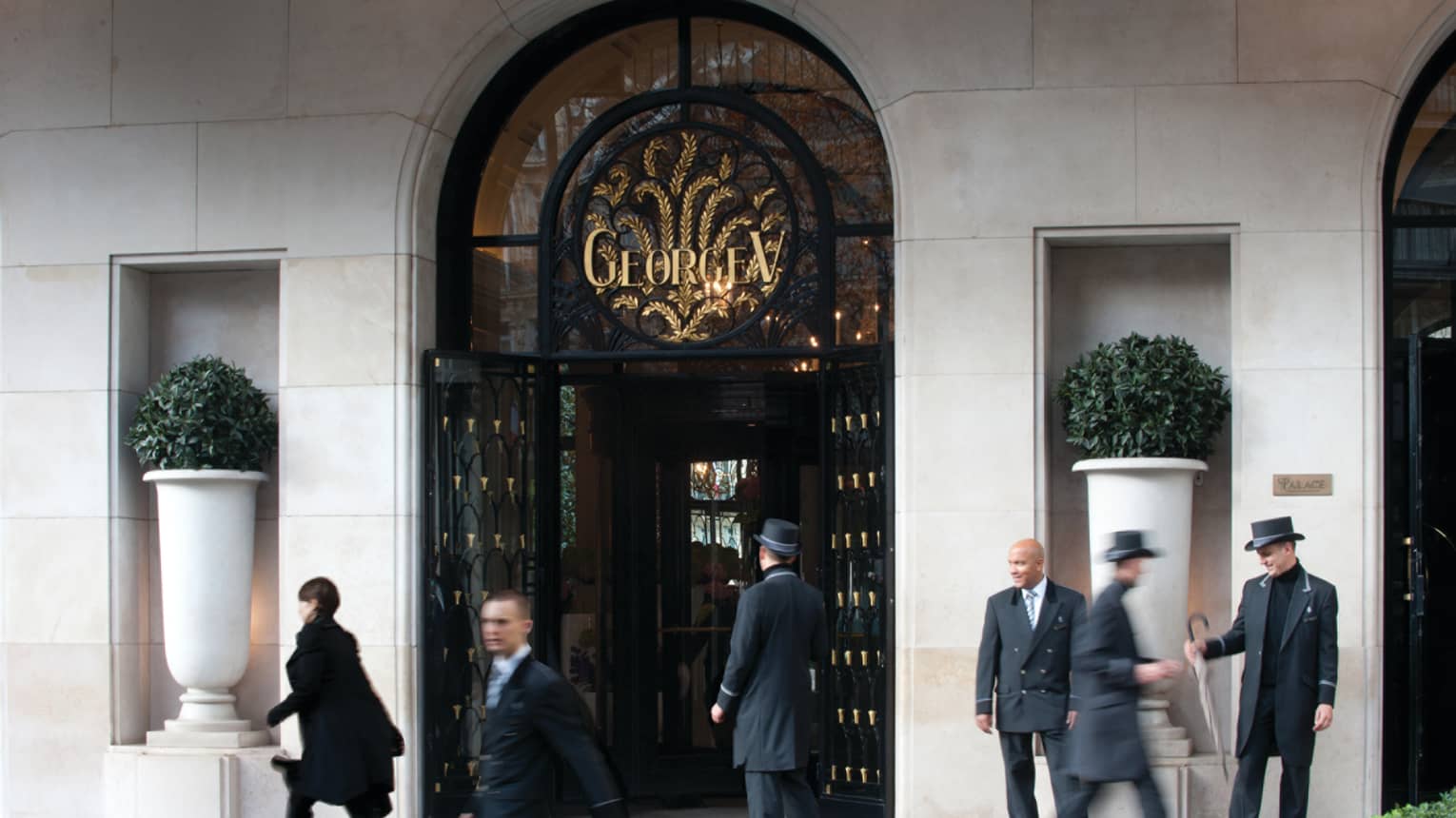 Розкішний п'ятизірковий готель знаходиться в серці столиці Франції по авеню George V за кілька кроків від Єлисейських полів, Лувру та інших визначних пам'яток Парижа. Готель був зведений у 1928 році і переносить своїх гостей в атмосферу, де зупинився час, збереглася пишність інтер'єрів, бездоганний сервіс та традиції французької аристократії. Four Seasons George V втілює архітектуру минулого – мармурові колони та каміни, просторі зали, прикрашені класичними статуями, гобелени, характерні для XVII століття, старовинні меблі, кришталеві люстри. У цьому готелі ніби ожила минула доба.