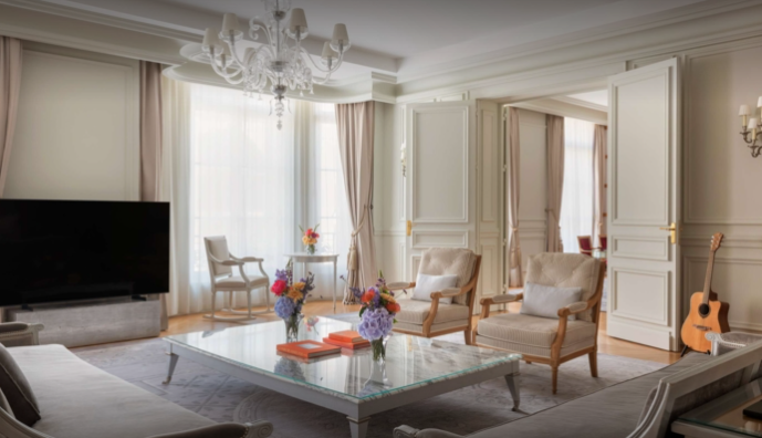 Президентський люкс Raffles гармонійно поєднує сучасний комфорт із традиційною паризькою елегантністю. Він включає в себе три просторі спальні, приватний тренажерний зал, розкішні вітальні, домашній кінотеатр, кухню для обслуговування та чудову їдальню.