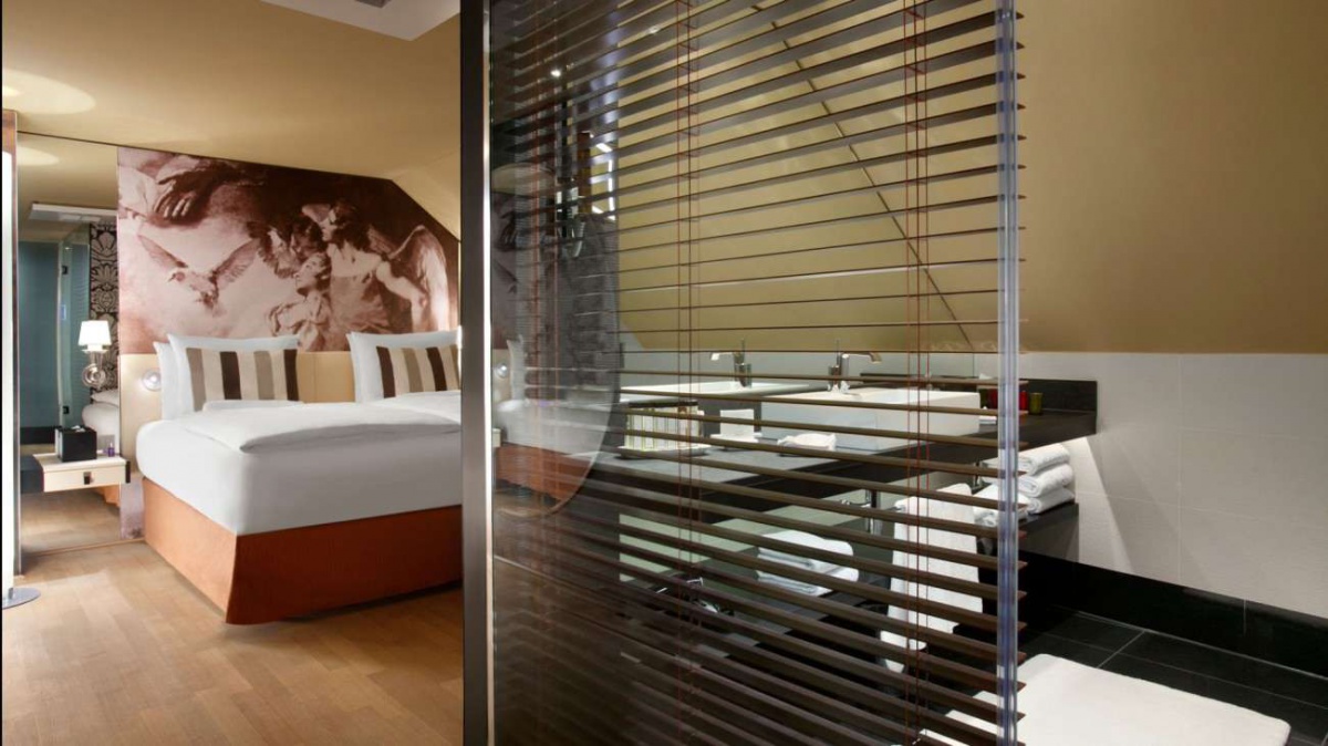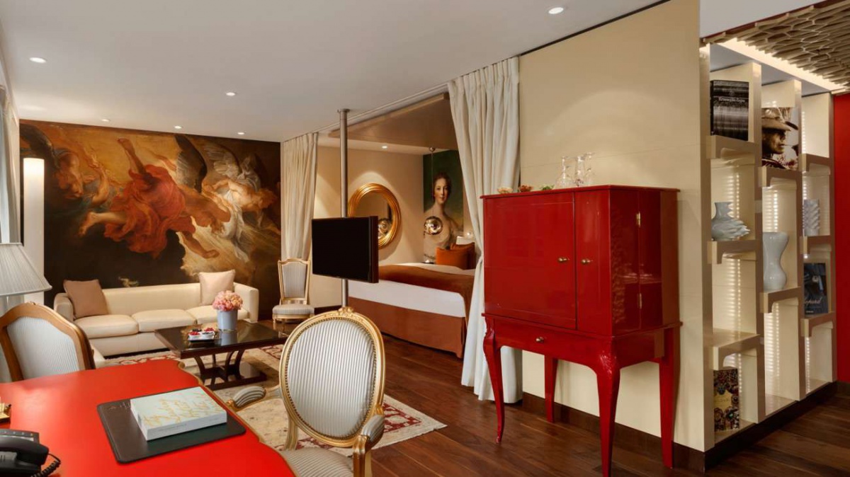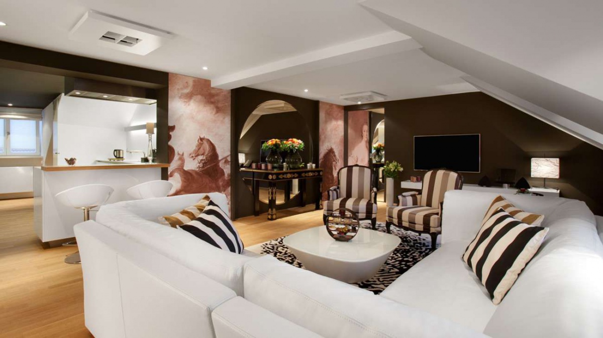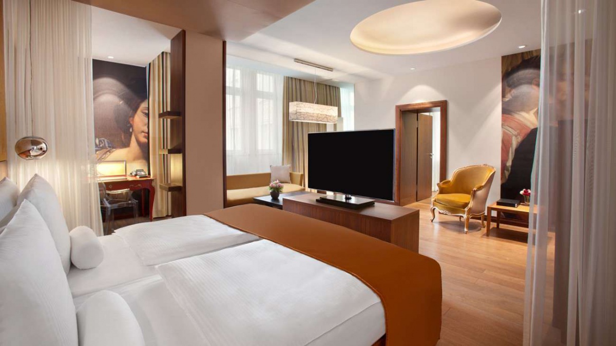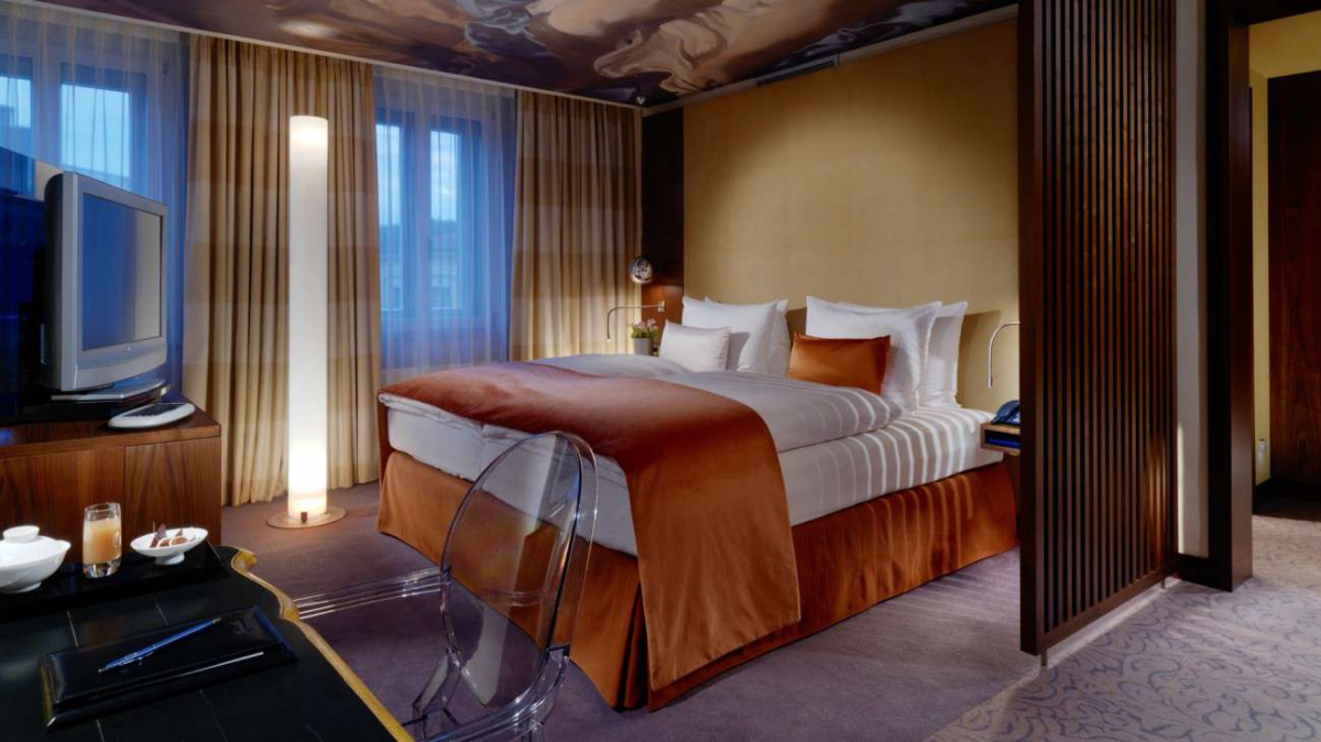 Ромашка Лудвиг Люкс: 190 кв.м. Незвичайний номер з видом на Максимілянхтрассе, прикраси творів мистецтва, античних меблів і ексклюзивності з натуральної шкіри, включає в себе простий вітальню, вітальню з зоною для їжі, робочу зону, дві спальні з двоспальними ліжками, два санвузли, гостьовий номер. Максимальне розміщення 4 дорослих + 2 дітей.