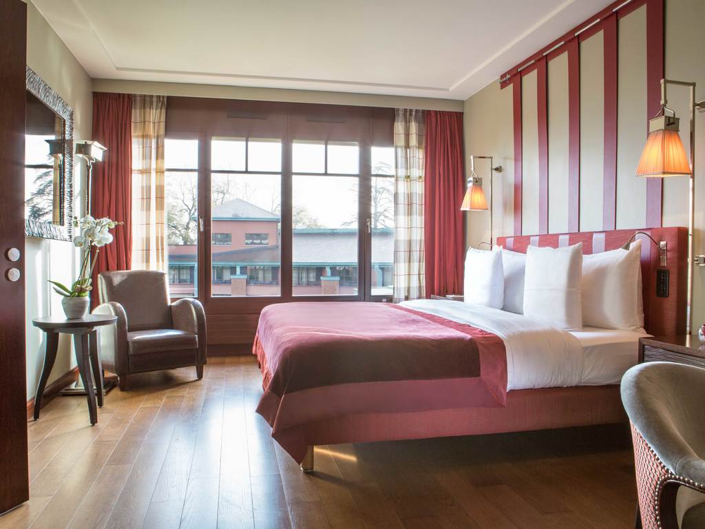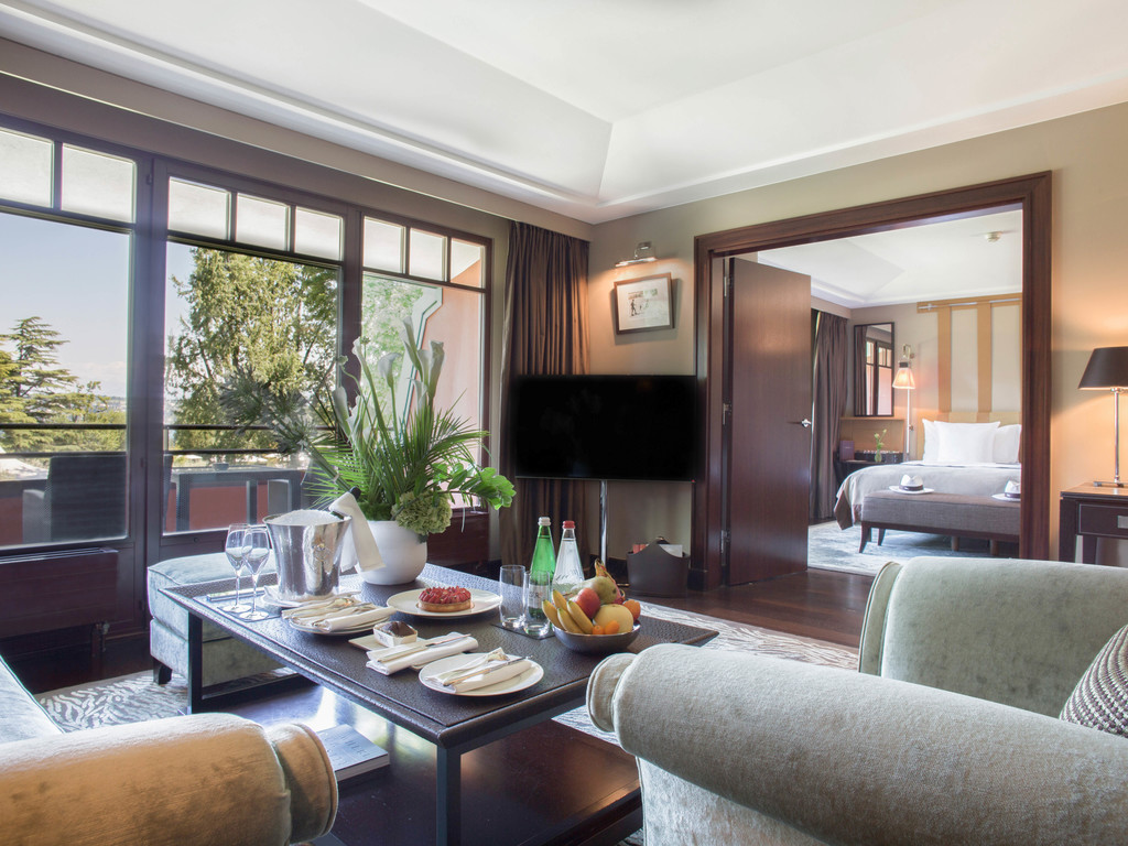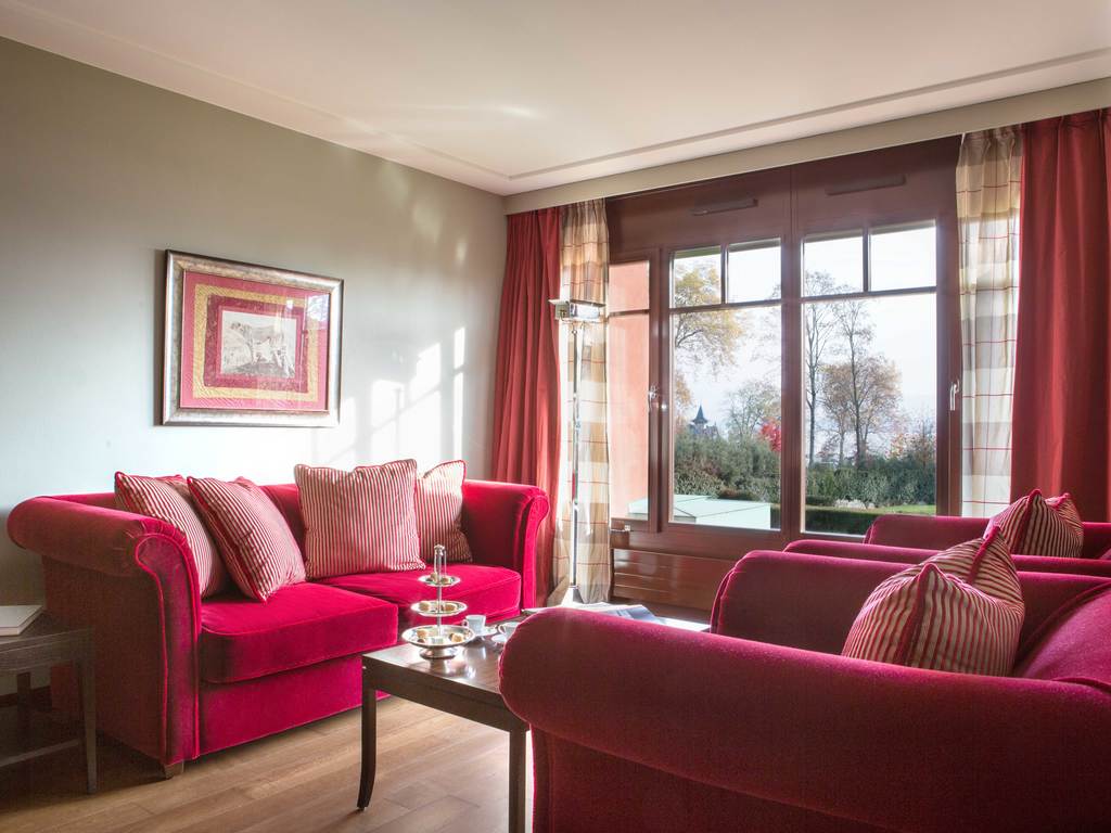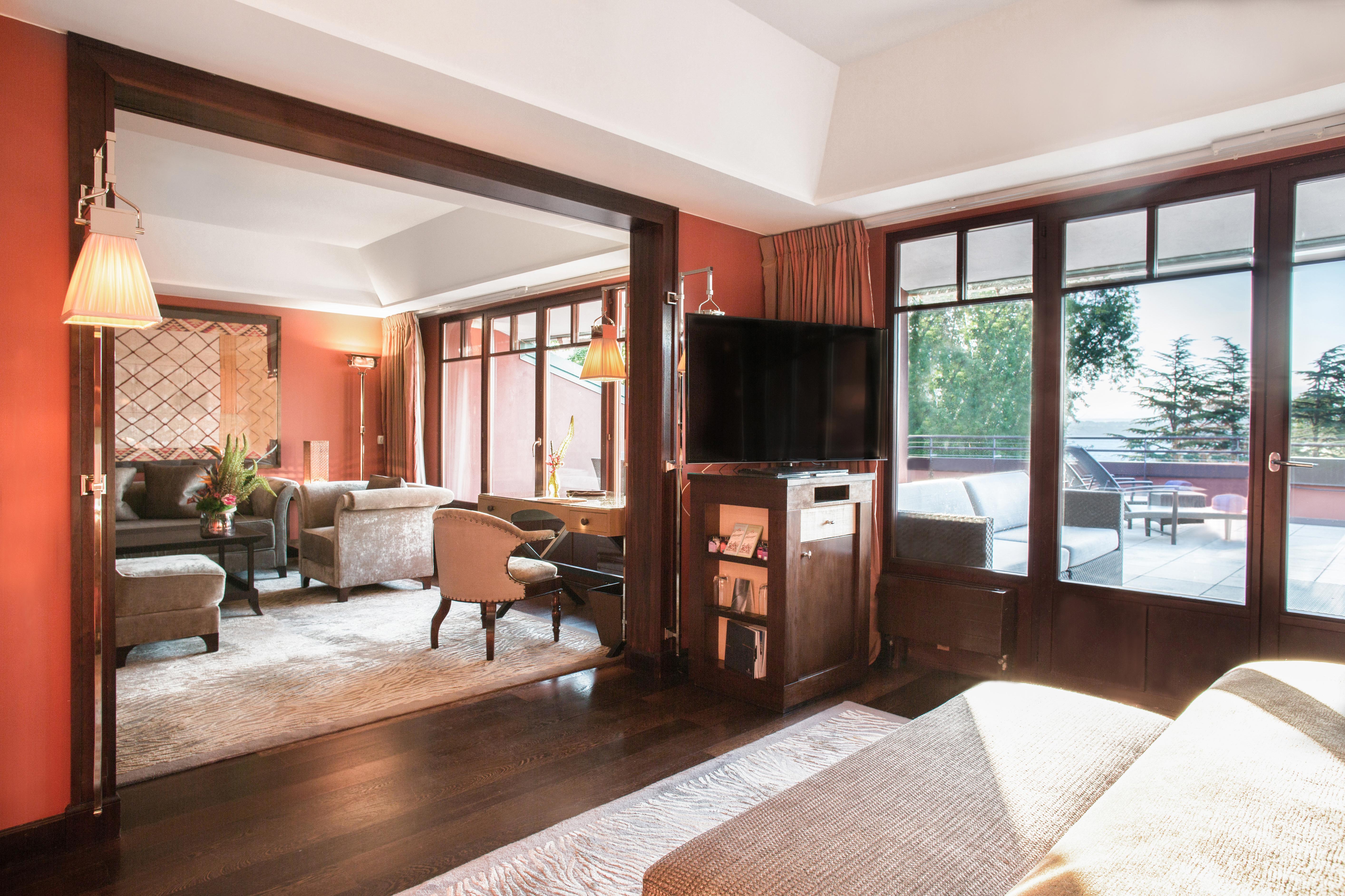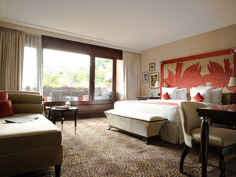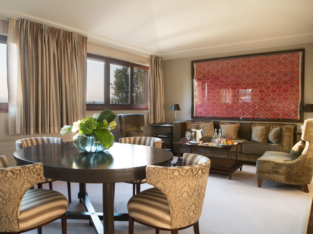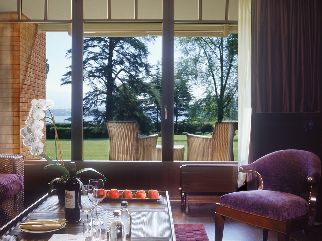 Площа 132 кв. м. Номер для пошуку і розкіш, що складається з кафетерії восьми осіб, вітальні, спальні з двоспальним ліжком, шафою, санвузлом з ванною, душем і гостьовою кімнатою. У готелі є два тераси загальною площею 158 кв. м, з видом на озеро Женева, Монблан і парк. Видалення відповідного номера.