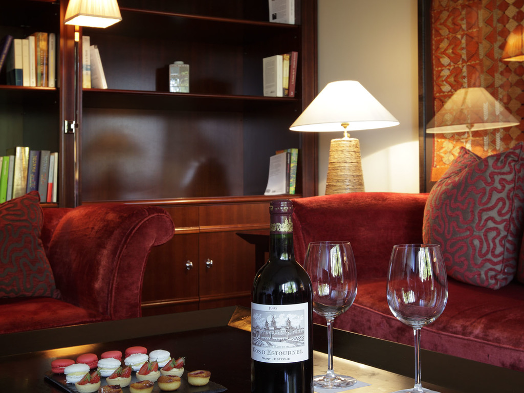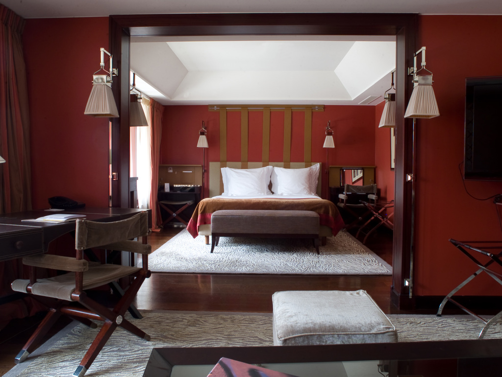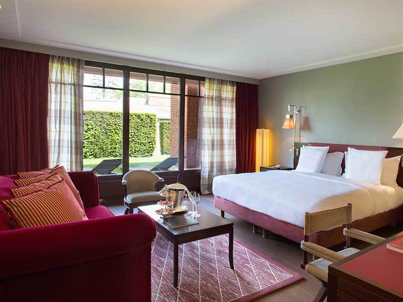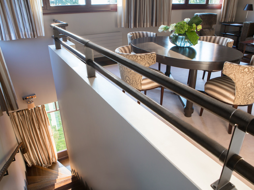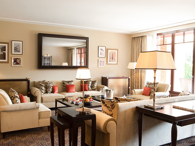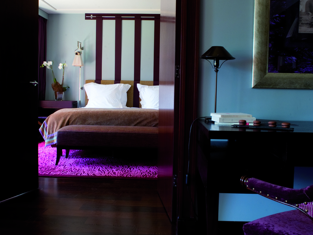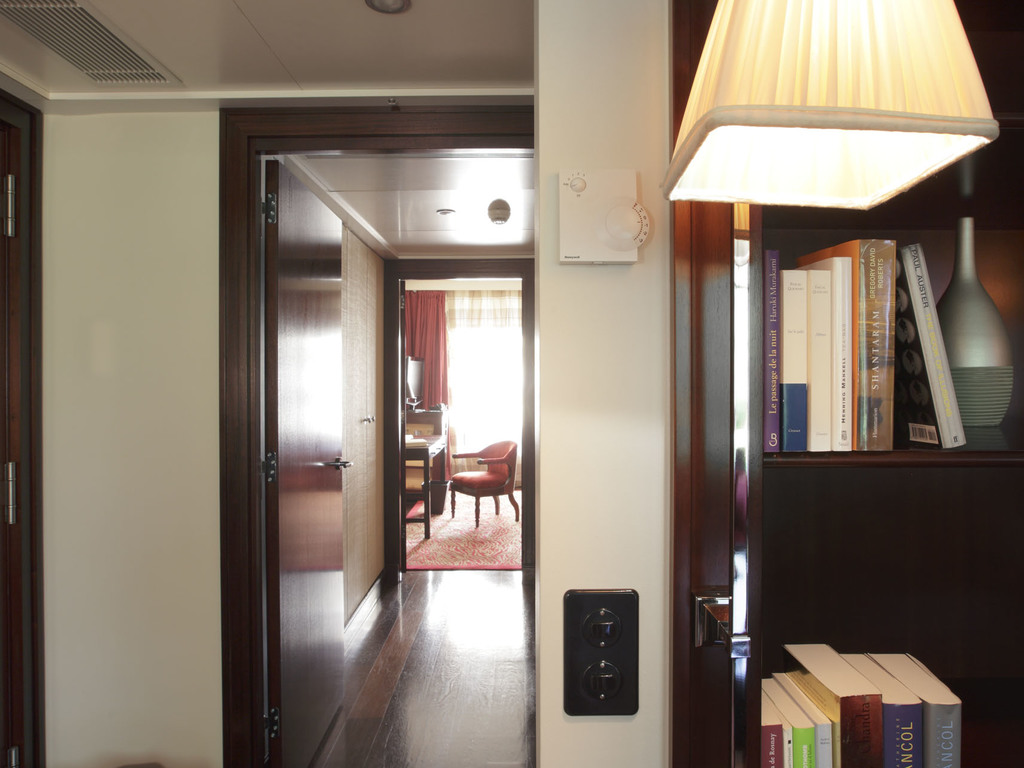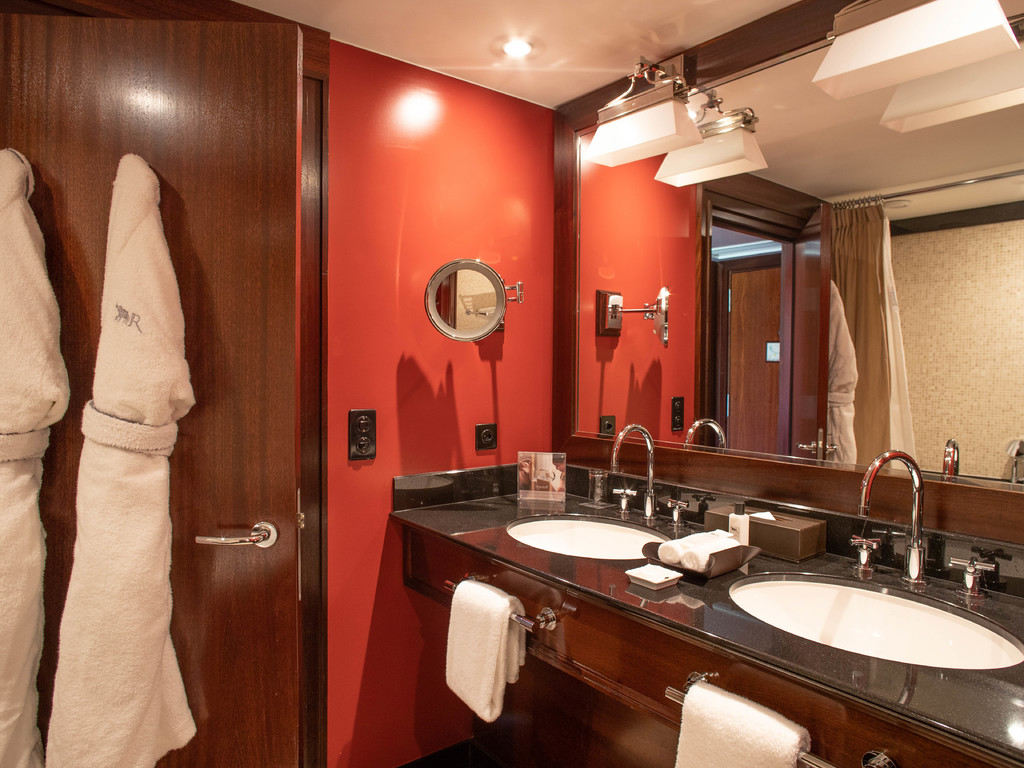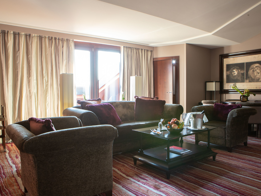 Площа 132 кв. м. Номер для пошуку і розкіш, що складається з кафетерії восьми осіб, вітальні, спальні з двоспальним ліжком, шафою, санвузлом з ванною, душем і гостьовою кімнатою. У готелі є два тераси загальною площею 158 кв. м, з видом на озеро Женева, Монблан і парк. Видалення відповідного номера.