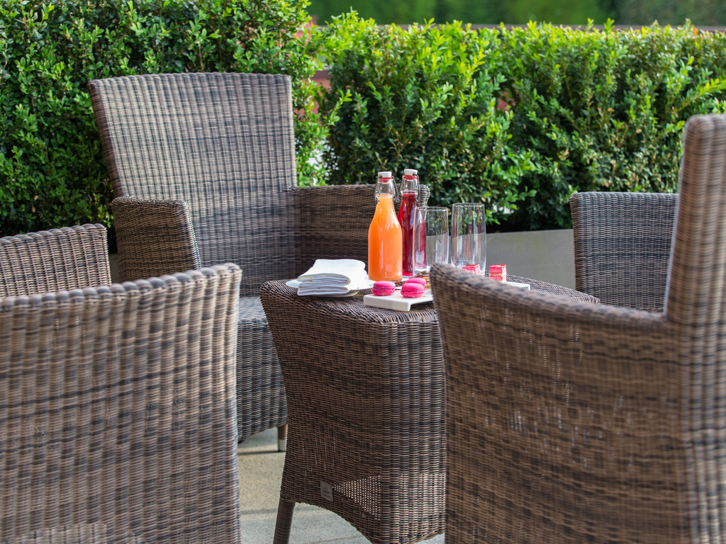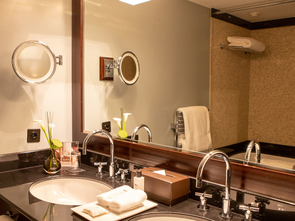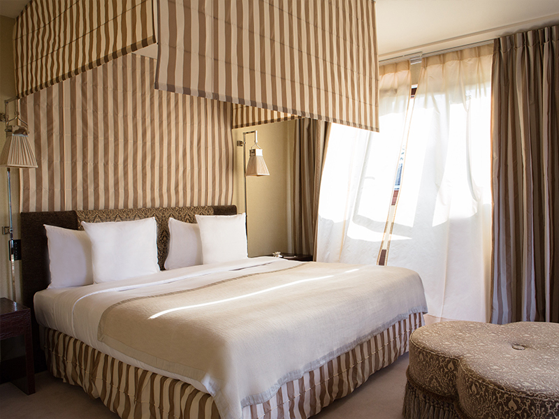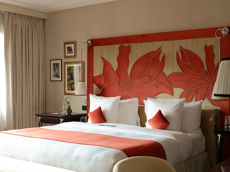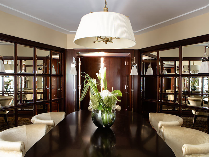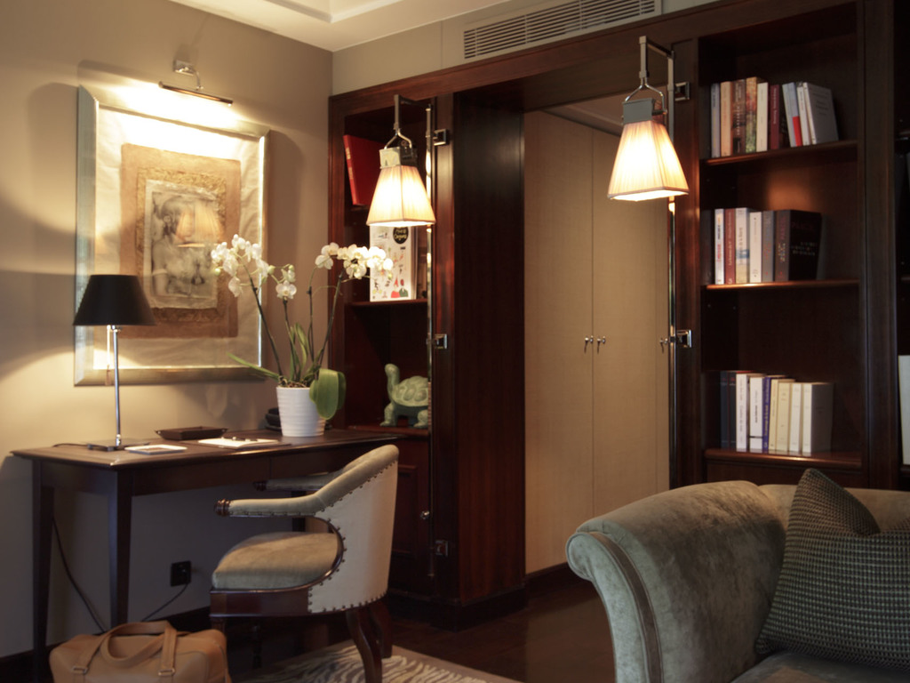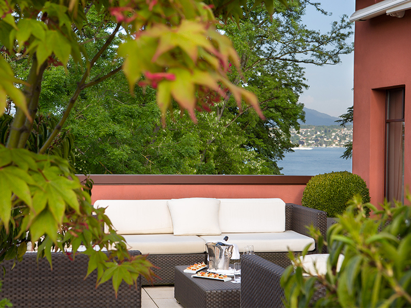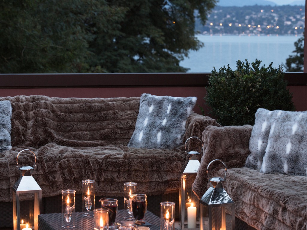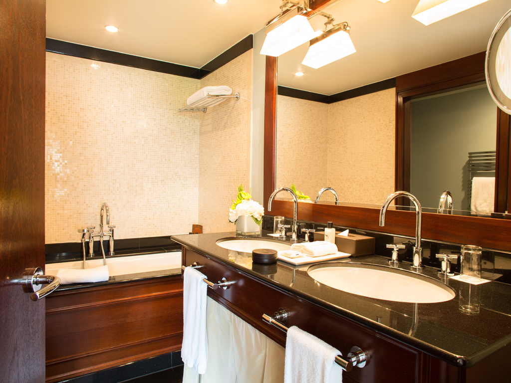 Площа 132 кв. м. Номер для пошуку і розкіш, що складається з кафетерії восьми осіб, вітальні, спальні з двоспальним ліжком, шафою, санвузлом з ванною, душем і гостьовою кімнатою. У готелі є два тераси загальною площею 158 кв. м, з видом на озеро Женева, Монблан і парк. Видалення відповідного номера.