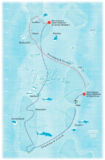 39-метровий білий трипалубний катамаран Four Seasons Explorer надає унікальні можливості для знайомства з культурою, традиціями та красивою природою Мальдівських островів, а також багатим підводним світом Індійського океану. Пропонуються круїзи тривалістю від 3 до 7 днів, за напрямами Північний Перехід та Південний Хрест, під час яких можна відвідати понад 10 найвідоміших місць для дайвінгу, побачити екзотичні атоли та поспостерігати за життям океанської фауни. На катамарані знаходиться 11 комфортабельних кают, в яких - елегантні сучасні інтер'єри в пастельних тонах, зручні меблі з дерева тика, вишукані елементи декору. Також на борту Four Seasons Explorer є невеликий басейн-джакузі, центр дайвінгу PADI, пропонуються водні види спорту, підводне плавання, лекції морського біолога, пляжний волейбол та футбол на островах, нічна та глибоководна рибалка, розважальні та екскурсійні програми, для бажаючих – послуги кваліфікованого масажиста.