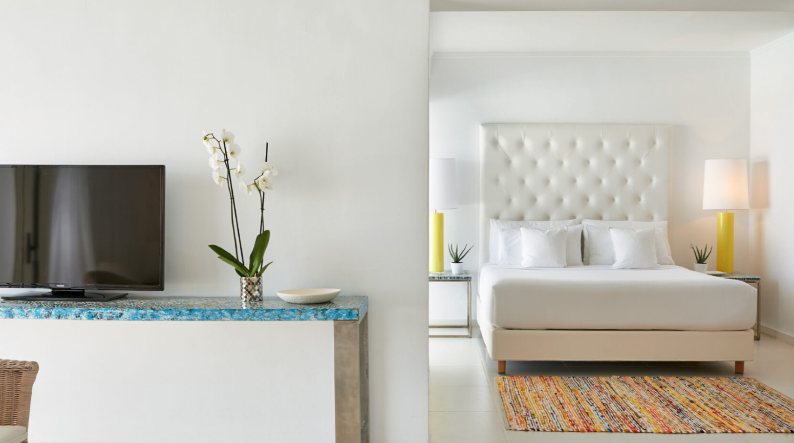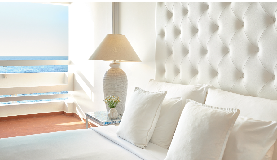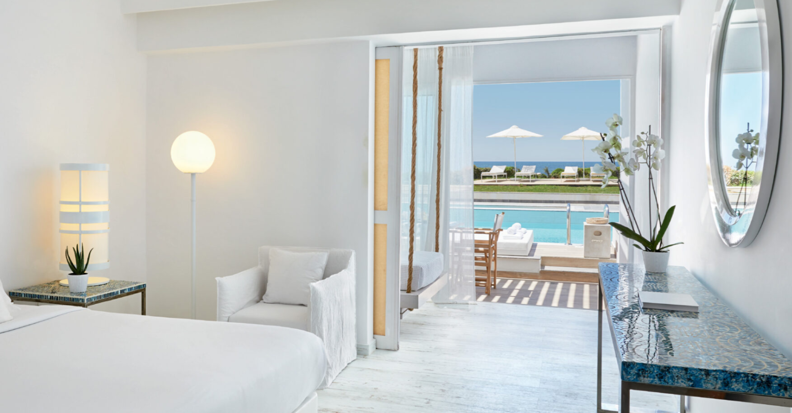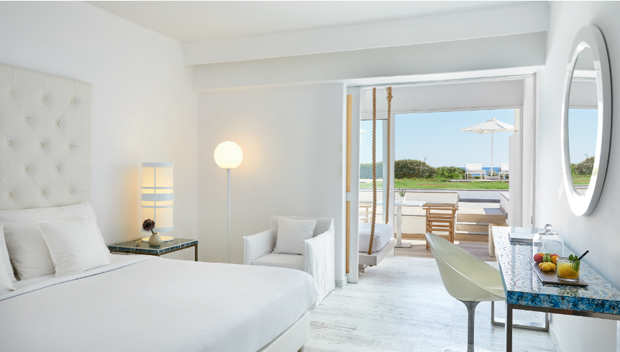 15 різноманітних категорій розкішних номерів. Повітряні, з чарівним краєвидом на море, всі номери в білому кольорі, характерному кольоровій гамі готелю. Міні-бар, що поповнюється щодня, набір для приготування чаю та кави, Wi-Fi, сейф та сучасні зручності – стандарт готелю.