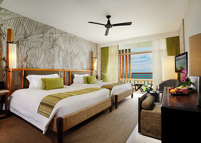 42 кв. м Номер вкрадений барельфами і має Дві спальні з двома ліжками з бамбукові та робочою зоною, посилкою, душовою ванною кімнатою та галькою з видом на океан.Розміщення 2 дорослих і 2 дітей.