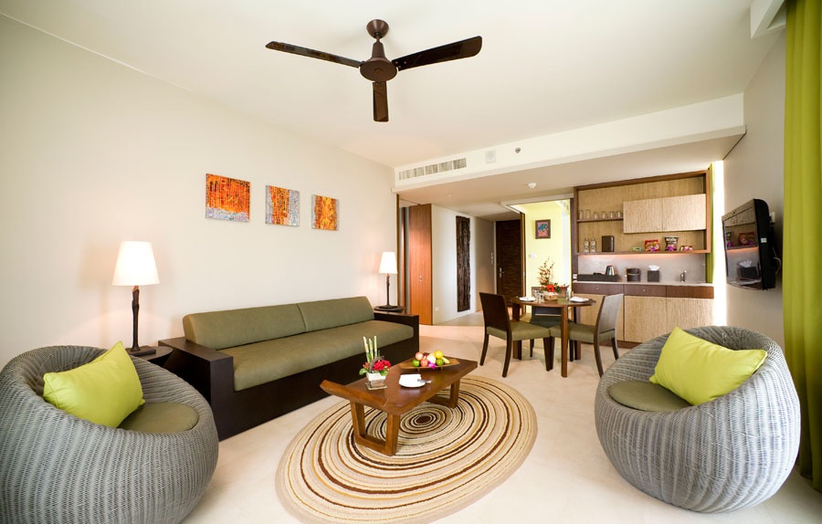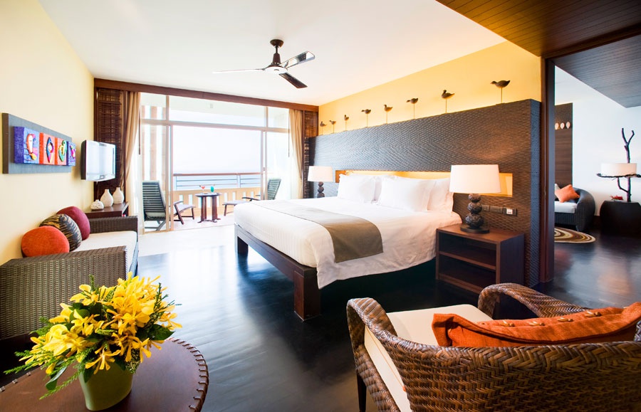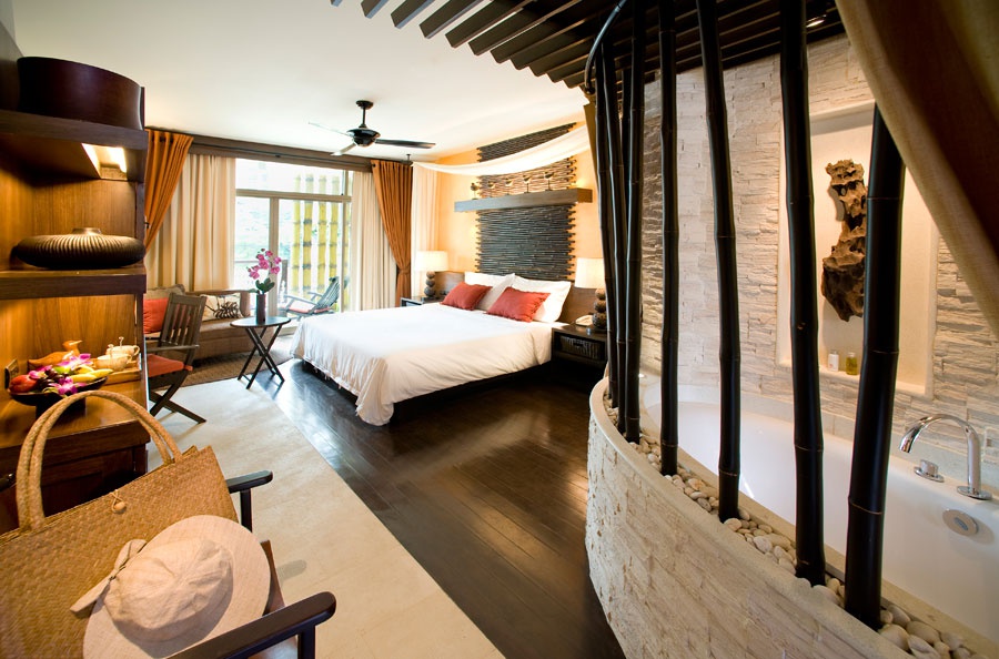 42 кв. м Номер, прикрашений барельфами і декором з дерева, має спальні з ліжком " розмір туризму " , з головою бамбука, диваном і робочою зоною, посилкою, спальною ванною кімнатою з душовою кабіною, прикрашеним джакузі балконом і видом на океан. Номер ідеально підходить для медового місяця. 2 дорослих і 1 дитина.