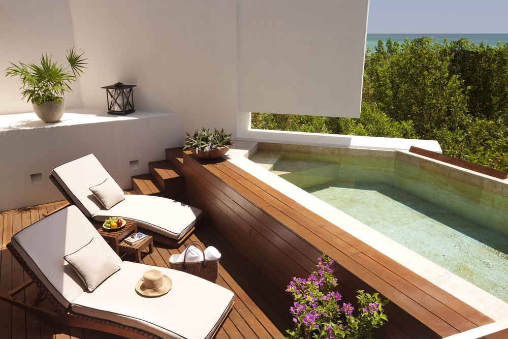 Beachfront studio suite: 72 кв.м, тераса (61 кв. м) з відкритим персональним басейном, спальня з ліжком king-size, ванна кімната. Розташовані на пляжі. Вид на море. Можливе поєднання номерів.
