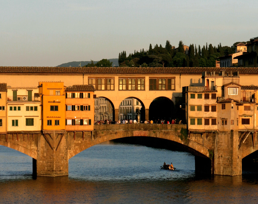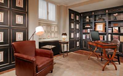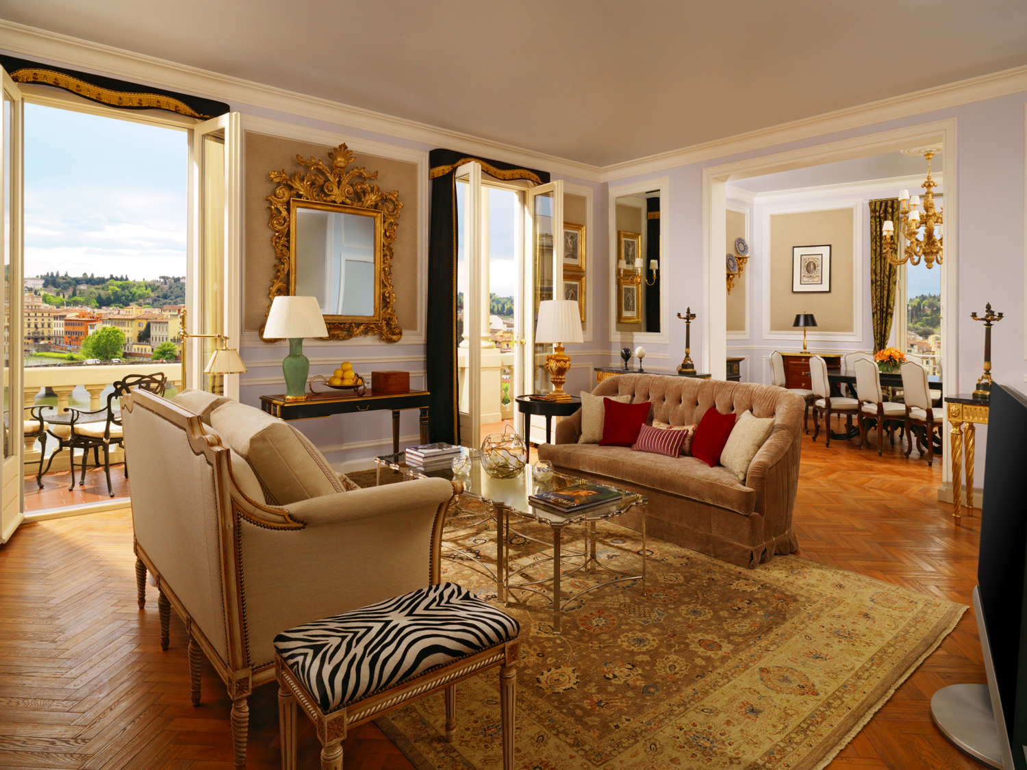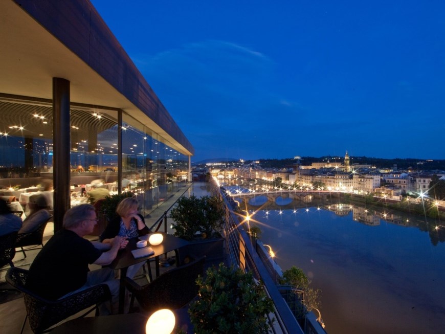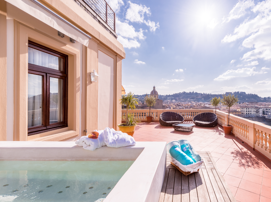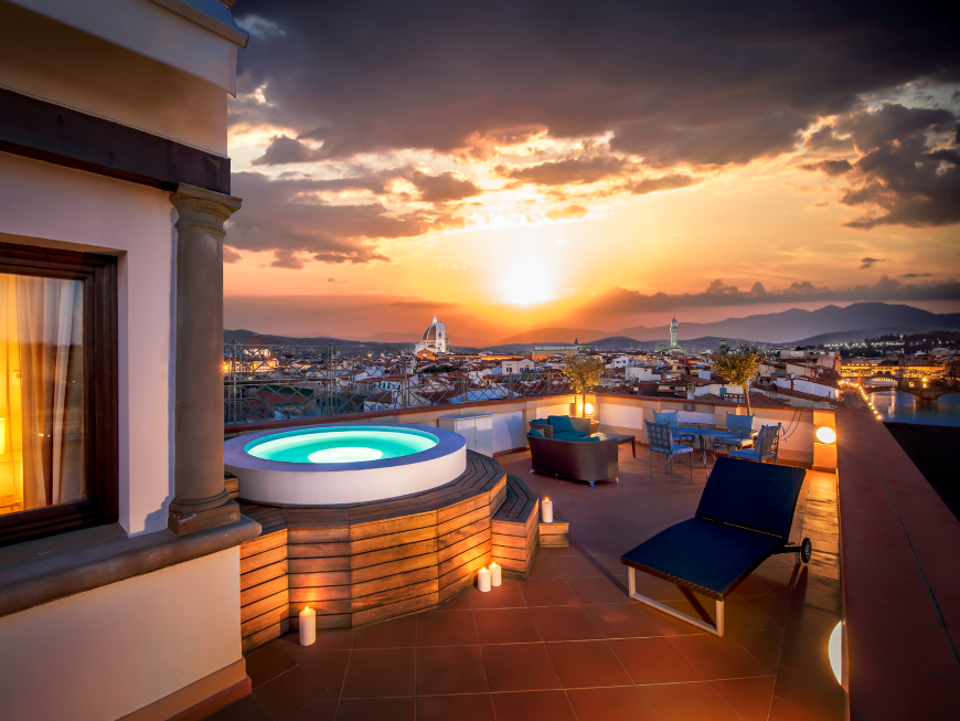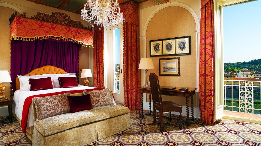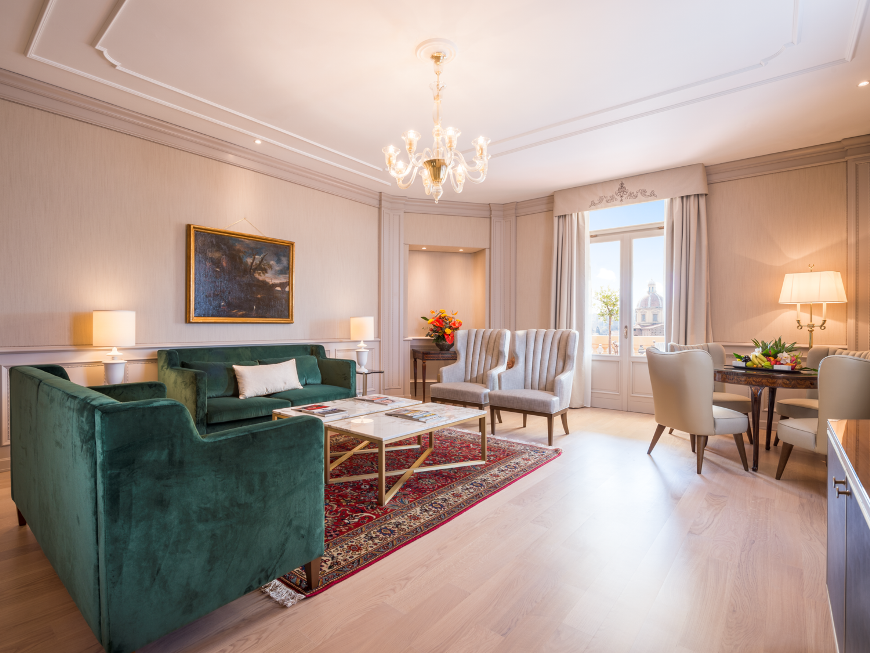 90-100 кв. м. Просторий люкс з витонченими інтер'єром має вишукані шкіряні меблі, новозеландські килими та дерев'яні підлоги. Номер має окрему спальню з ліжком розміру «king-size», вітальню з каміном та диван-ліжком, їдальню з обіднім столом на вісім персон, мармурову ванну кімнату з глибокою ванною, окремий душ і подвійну раковину, великий мебльований балкон з видом на річку Арно. Доступно бронювання додаткового спального місця та дитячого ліжка. Максимальне розміщення – 3 особи.