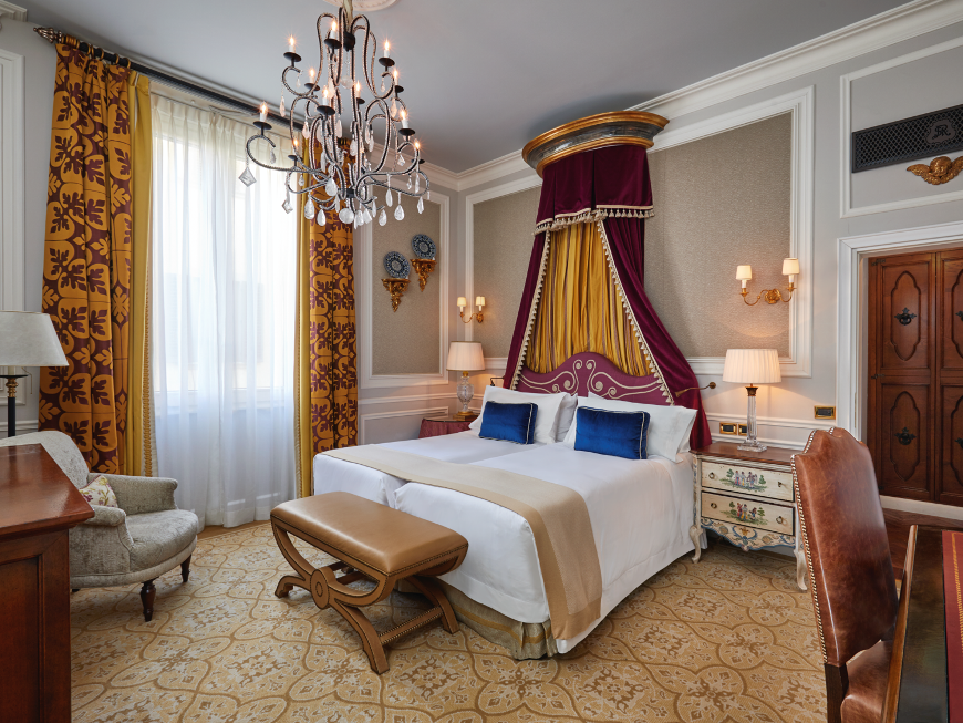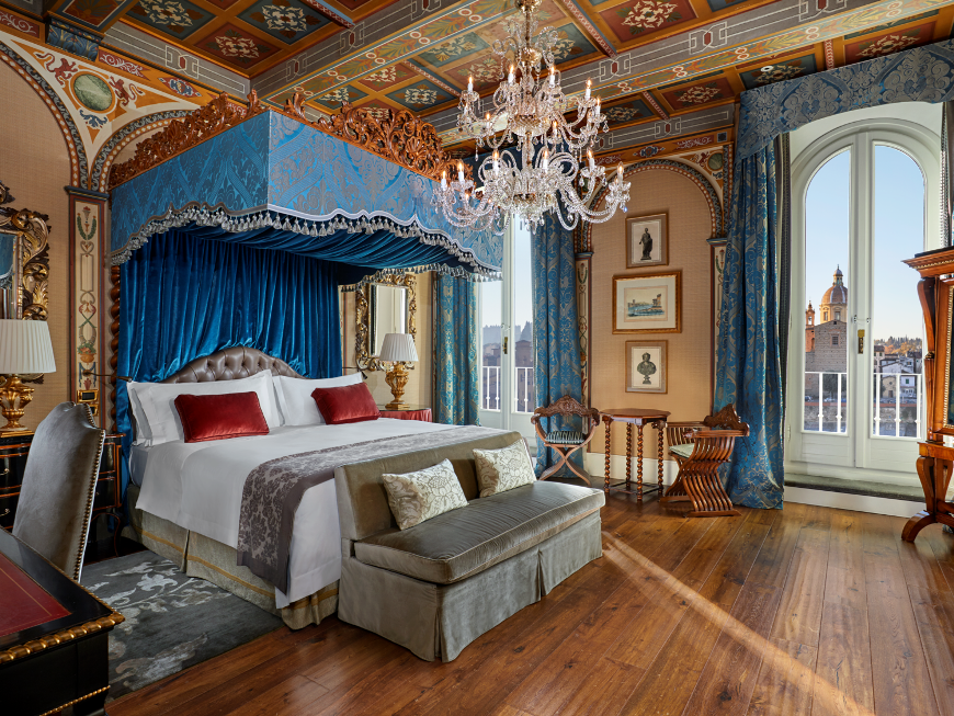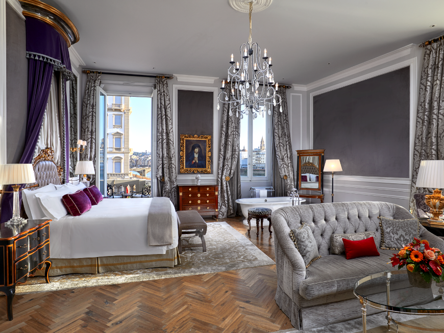 200 кв. м. Розкішний номер, розташований у фронтальній частині палацу, виконаний у стилі Медічі, прикрашений антикварними витворами мистецтва та обставлений вишуканими меблями. Люкс має в своєму розпорядженні простору спальню обладнану ліжком розміру «king-size», окрему вітальню з обідньою зоною, що вміщує до 8 осіб і зоною для відпочинку, гардеробну, ванну кімнату з італійського мармуру з глибокою ванною, подвійною раковиною та окремим душем, балкон з чудовим видом на річку Арно і Флоренцію. Доступне поєднання з додатковою спальнею, бронювання розкладного ліжка та дитячого ліжка. Максимальне розміщення – 3 особи.